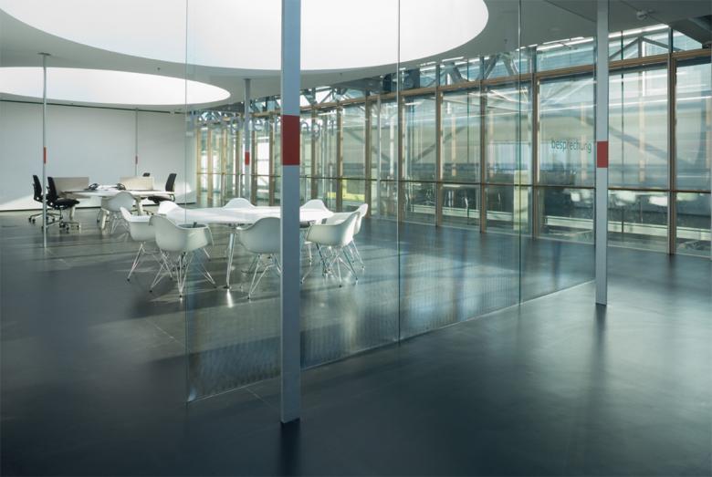 Zentrale Idee der Raumdisposition ist die Integration der Mitarbeiter in ein Team als Voraussetzung für den gemeinsamen Erfolg. Die in zahlreichen produzierenden Unternehmen vorhandene räumliche Trennung von Produktions- und Administrationsmitarbeitern ist durch unser Raumkonzept aufgehoben: Sämtliche Wege bei Schichtwechseln sowie in den Pausen führen über das großzügige ‚Mannschaftsdeck‘, hier begegnen sich Mitarbeiter aller Abteilungen (und auch Besucher) buchstäblich auf einer Ebene.