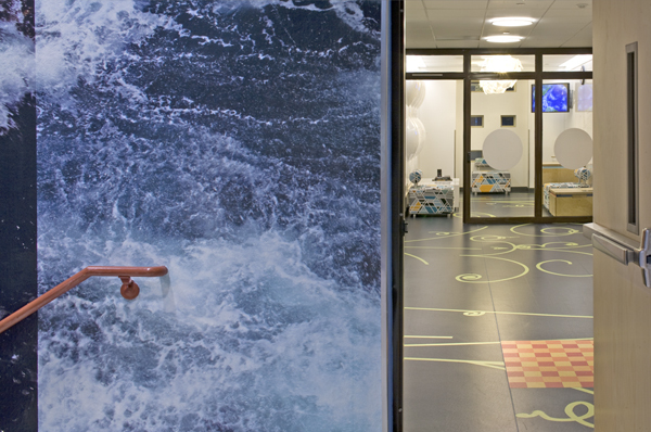 Students submerge into the waves, moving down and around to their next class. Representing the next wave for science education, the Interactive Forum immerses high school students of The Latin School in an opportunity and technology rich center, synthesizing analytical and aesthetic investigation and learning.