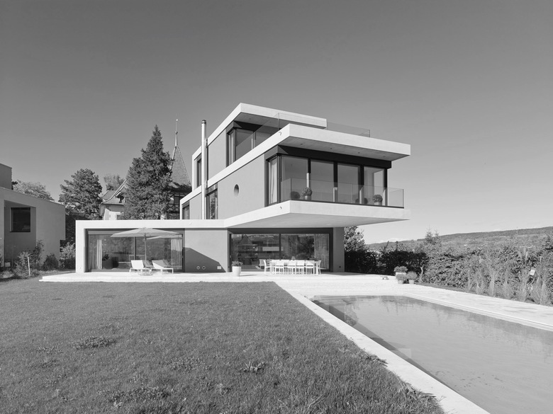 Das grosszügige Einfamilienhaus steht nahe einer Hangkante erhöht am Rande der Gemeinde Wädenswil. Die sich überlagernden Baukörper des Gebäudes, die Positionierung der Aussenterrasse im EG sowie der transparente gestaltete Wohn- und Essraum ermöglichen eine optimale Kombination von Seesicht auf der einen Seite der Wohnräume und Sonnenuntergang auf der anderen Seite.