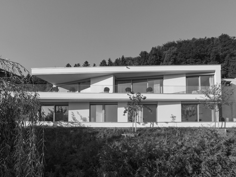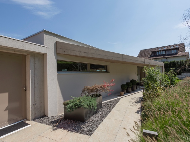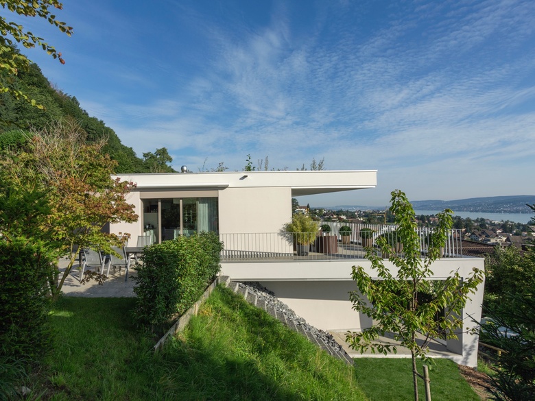 Das dreieckige, schwierig bebaubare Grundstück an exklusiver Lage mit uneingeschränkter Seesicht von Zürich bis Rapperswil, die Sonne im Rücken, ergaben die Parameter für die gewählte Formensprache.