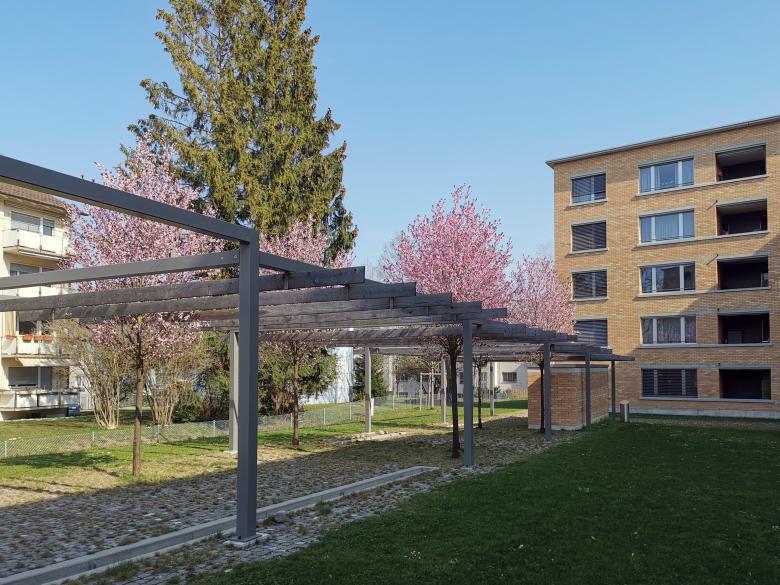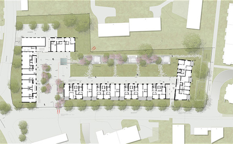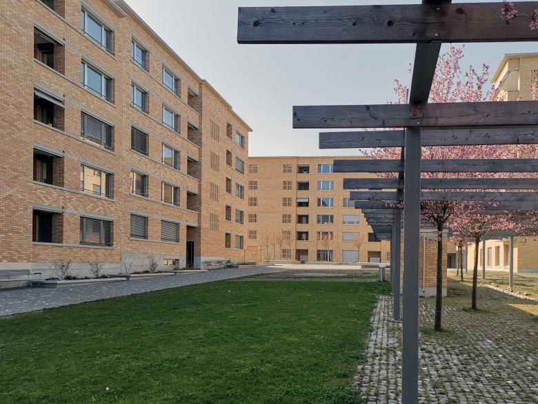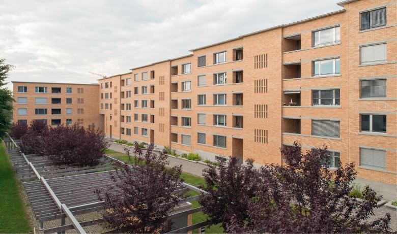 Zwei winkelförmige Volumen fassen die Strassen zu Räumen und formen einen grundstücksübergreifenden, grosszügigen Hof. Ein Platz im Westen und ein Durchgang im Osten verbinden den öffentlichen Raum mit dem Hofraum, über den alle Wege zu den Hauseingängen für fast 100 Wohnungen und Ateliers führen. Kleinformatige Backsteine umhüllen die beiden Volumen.