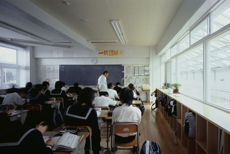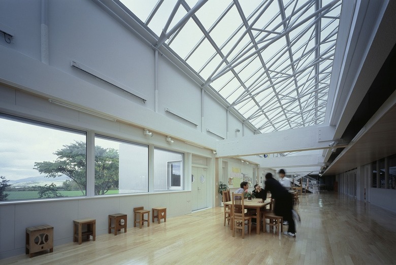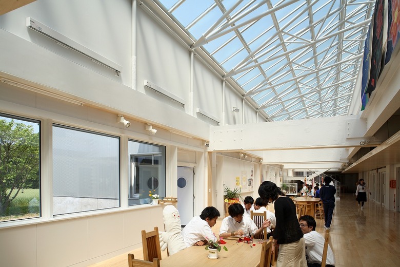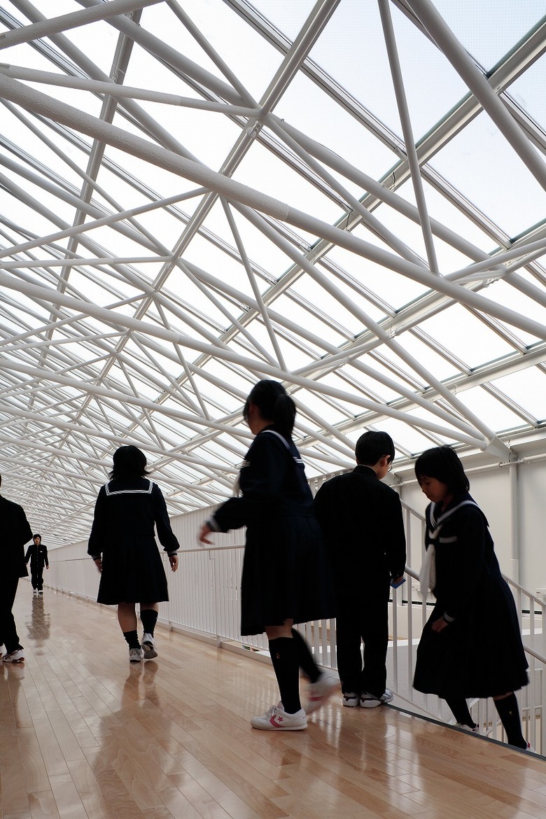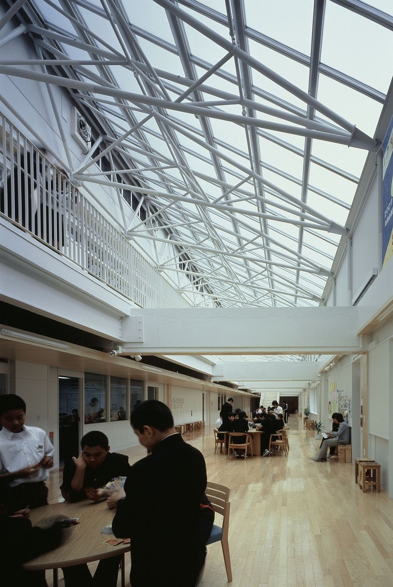 RC2階建て既存校舎の大規模改修を通してサスティナブルな建築の在り方を模索した。既存建物の中央部を一部解体することで減築による耐震性能を高め、併せてガラス屋根による自然採光・自然通風を導入して消費エネルギー削減を果たした。シンボリックな2層吹き抜け空間から子供の活動の場に光が満ち溢れる。