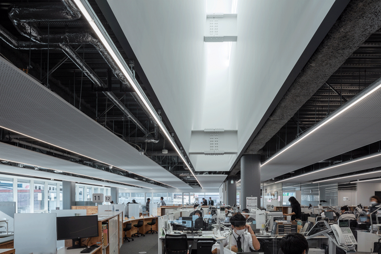 正方形プランの中央に執務室を配置し、その周囲を回遊できる動線計画とした。執務室は課長席を設けないユニバーサルレイアウトを採用することで、無駄なスペースを省き効率化を図った。外周部が自然光や温度を吸収し、執務室の安定した温熱環境とムラのない光環境を獲得した。