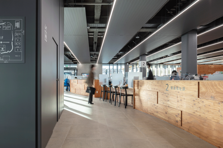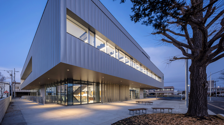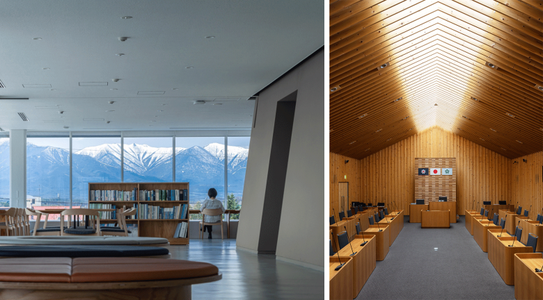 限られた敷地に正方形プランを重ねた表裏のないデザインで、3階をセットバックさせて周囲の住宅スケールに馴染む佇まいとした。四周に張り出した2階の深い軒下空間が雨や雪を防ぎ、まちと庁舎の緩衝空間となって内外をつなぐ。全面ガラスで囲われた1階は、街路と直結する3か所の出入口から自由にアクセスすることができる。1階全体が町民を受け入れる、ピロティを内部化したような空間となることを意識した。