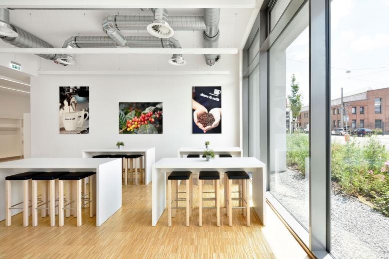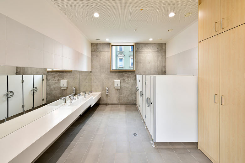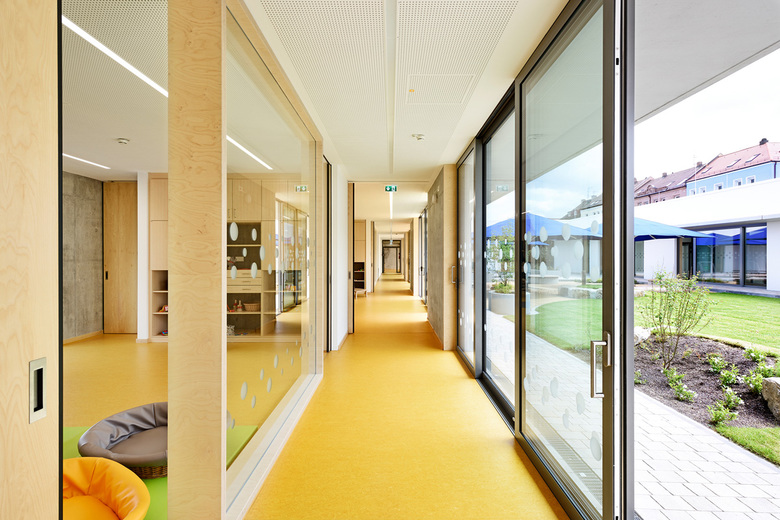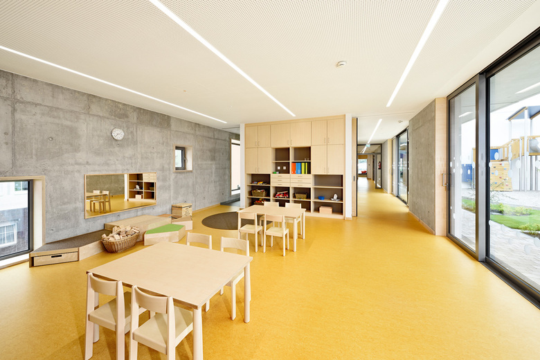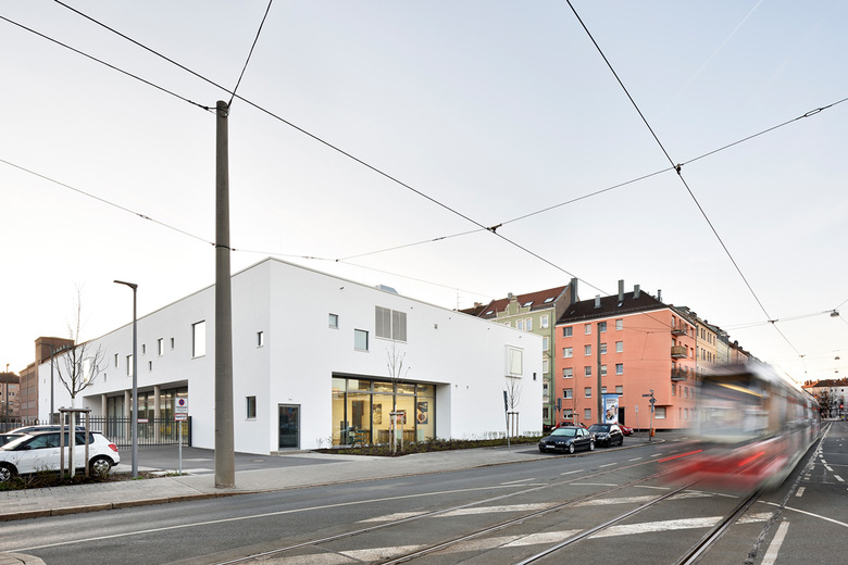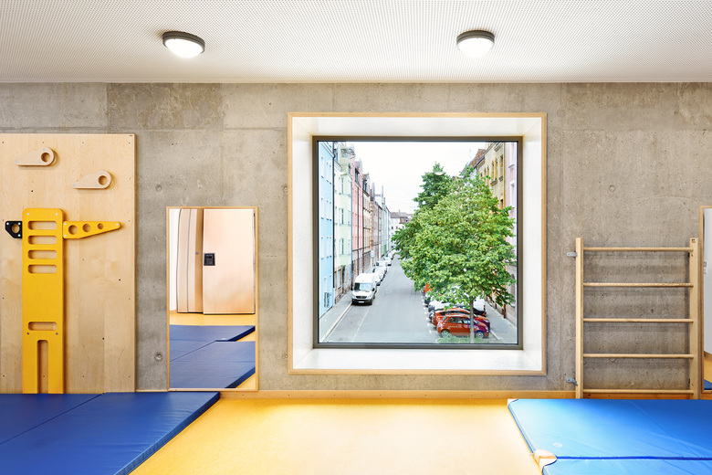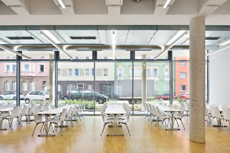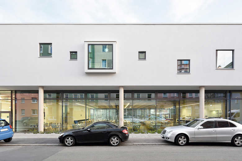 Sprache für seine bipolare Nutzung, die unterschiedlicher kaum sein kann: im Erdgeschoss Kantine, im Obergeschoss SieKids. Eine gemeinsame Haut überspannt die „Gemengelage“ unterschiedlicher Funktionalität. Nur die Perforation der Gebäudehülle durch unterschiedlich geartete Fensteröffnungen in den öffentlichen Raum verweist auf die unterschiedlichen Nutzungen.