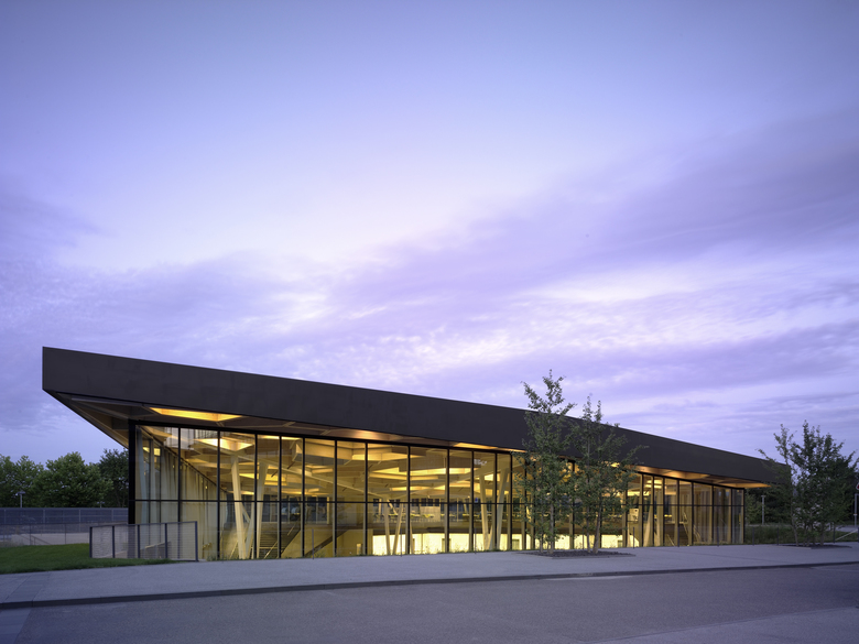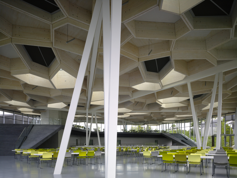 Der Bau entwickelt sich aus der Landschaft heraus: Ein großer Teil des Gebäudes ist unter Erdgeschossniveau abgesenkt. Über dem insgesamt bis zu neun Meter hohen Hauptraum und einer Galerie-Ebene schwebt eine leichte, weit spannende Dachfläche. Deren raumprägende Tragstruktur ist aus der Untersuchung natürlicher Formen und Strukturen abgeleitet und ähnelt in ihrem Aufbau dem eines Blattes. Die Grundfigur des Fünfecks wird, ebenso wie die sie untergliedernden Dreiecke, von einer Primärkonstruktion aus Stahl ausgebildet. Die Dreiecke wiederum werden von Holzwaben unterschiedlicher Höhe ausgefüllt, von denen einige das Dach als Oberlichter durchdringen.