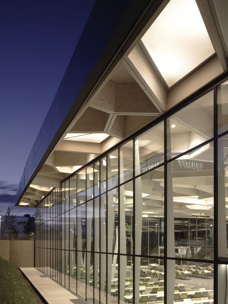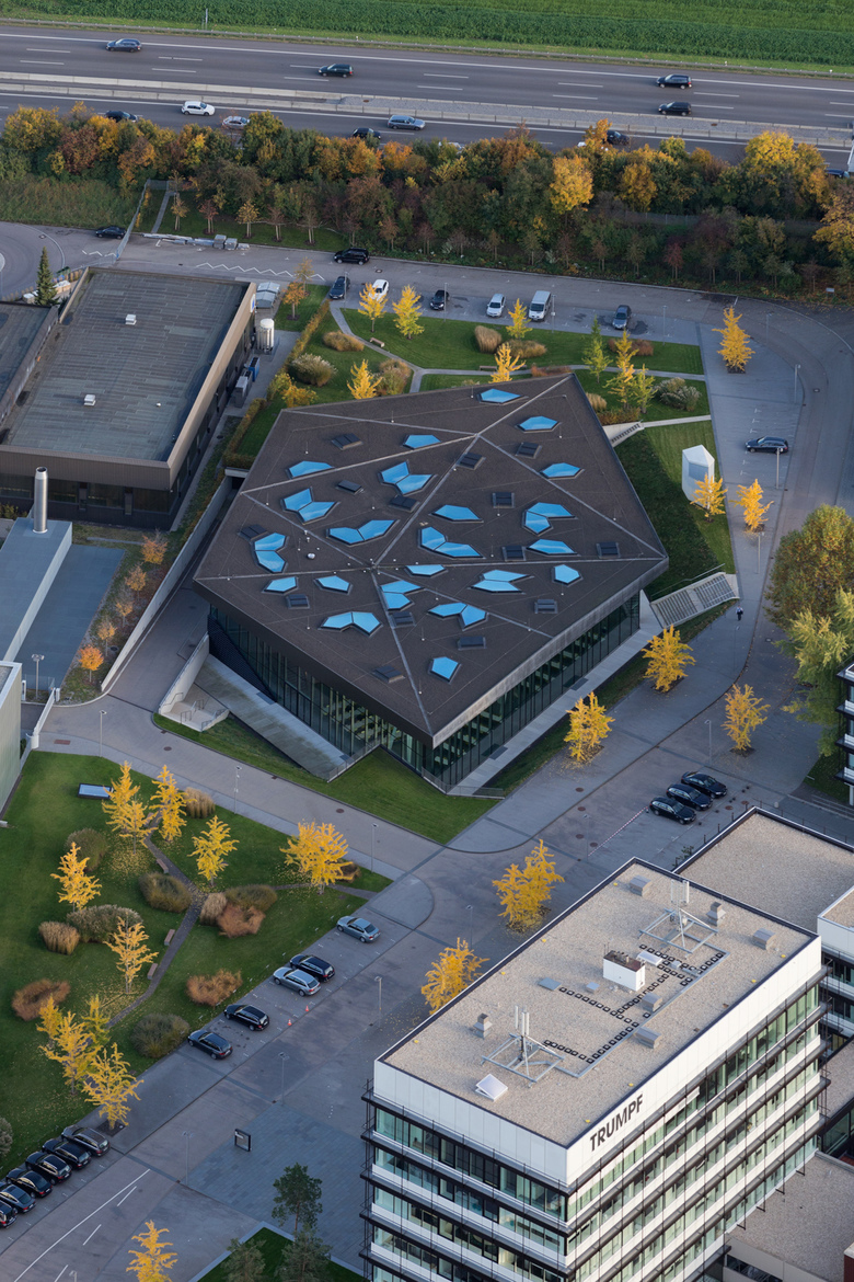 Mit dem 'Blautopf', einem Veranstaltungs-, Ausstellungs- und Eventspace im Betriebsrestaurant, wurde auf dem Firmengelände von Trumpf in Ditzingen ein neuer Gebäudetypus realisiert, der sich städtebaulich in das Ensemble der umgebenden Büro- und Produktionsgebäude einfügt und eine neue Mitte auf dem Campus etabliert hat. Der flache, fünfeckige Pavillon gibt dem bereits durch polygonale Formen geprägten Vorplatz vor dem Vertriebszentrum eine angemessene räumliche Fassung. Der großzügige Innenraum eignet sich für eine vielfältige Nutzung und dient neben dem Betrieb als Restaurant auch als Ausstellungsfläche oder Auditorium für Veranstaltungen.