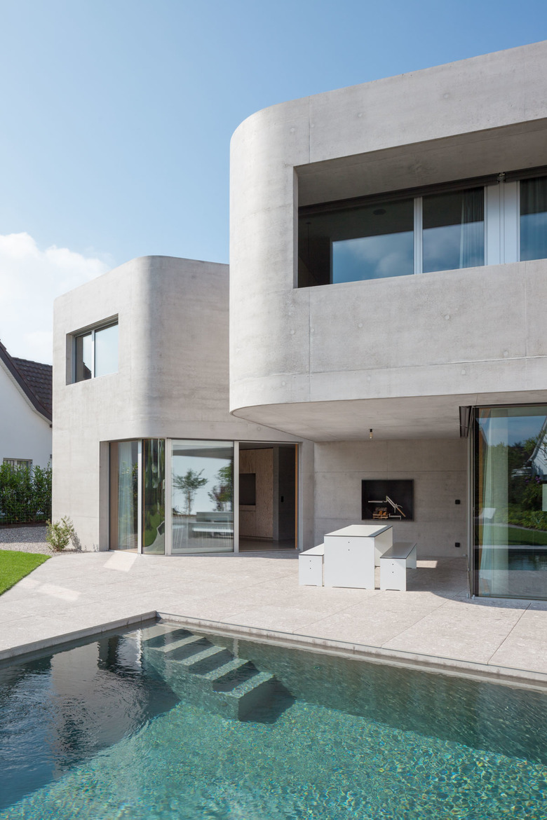 Das zweigeschossige Einfamilienhaus befindet sich nahe der Stadt Basel auf einer Anhöhe im Villenquartier einer Agglomerationsgemeinde. Etwas von der Strasse zurückgesetzt gelangt man über einen Privatweg auf das parkähnliche Grundstück und zum auf der Nordseite platzierten Haus. Verschiedene Vor- und Rücksprünge sowie die abgerundeten und mit unterschiedlichen Radien ausgeführten Ecken verleihen dem Gebäude ein skulpturales und dynamisches Erscheinungsbild.