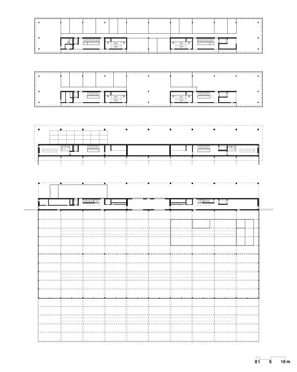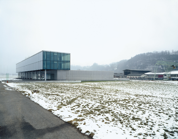 Der transparente, repräsentative Bürokörper trohnt auf dem massiv wirkenden Produktionssockel. Die Überschneidung der beiden Volumen akzentuiert den Zugang und gibt dem Gebäude eine Richtung.