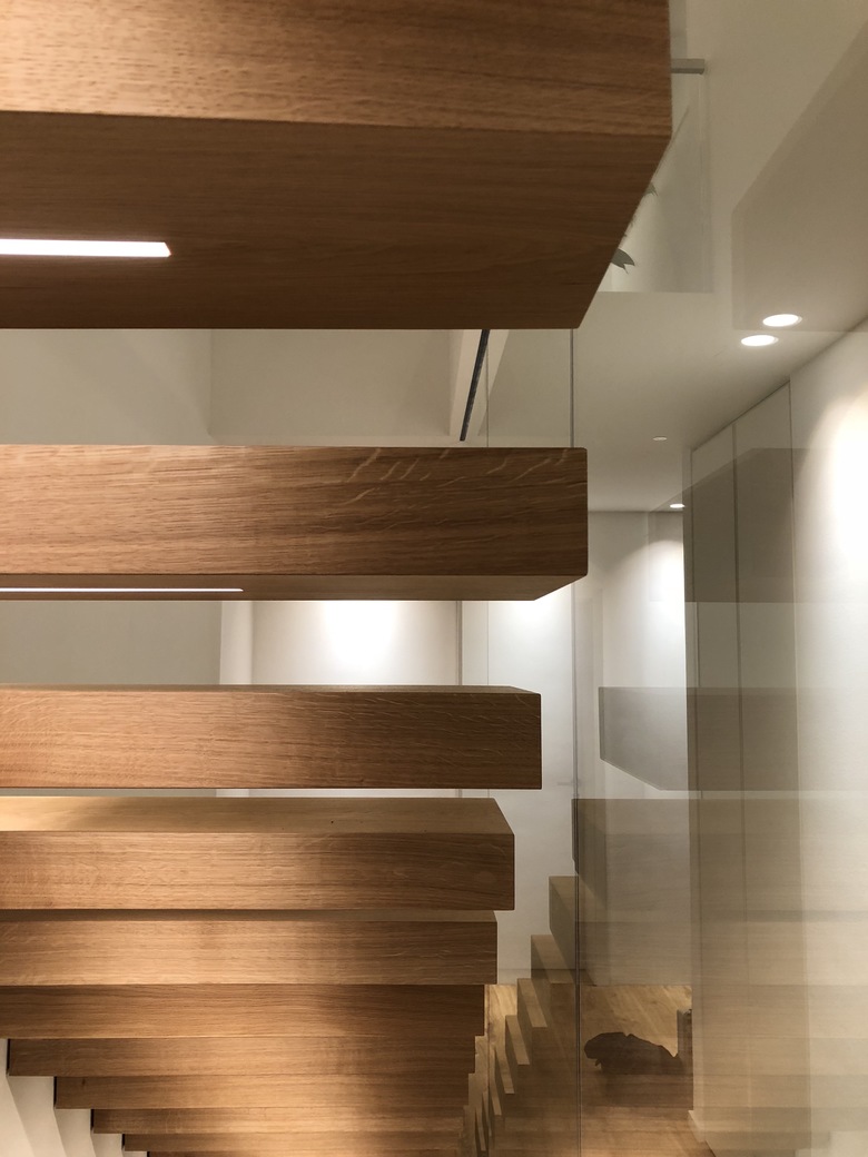Eine Kragarmtreppe mit Ganzglasbrüstung bildet ein skulpturales Element. Sie wird aus verschiedenen Perspektiven in Szene gesetzt und wahrgenommen. Die Wand aus der die Treppe kragt, läuft über 3 Geschosse durch das Haus und ist mit integrierter Beleuchtung und einer Lichtvoute über die volle Länge ausgestattet.