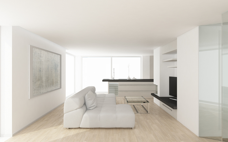 Das komplette Erdgeschoss ist als offener Raum gestaltet. Gegliedert wird dieser durch einen geschickt platzierten Einbaukörper der verschiedene Funktionen auf den unterschiedlichen Seiten hat.