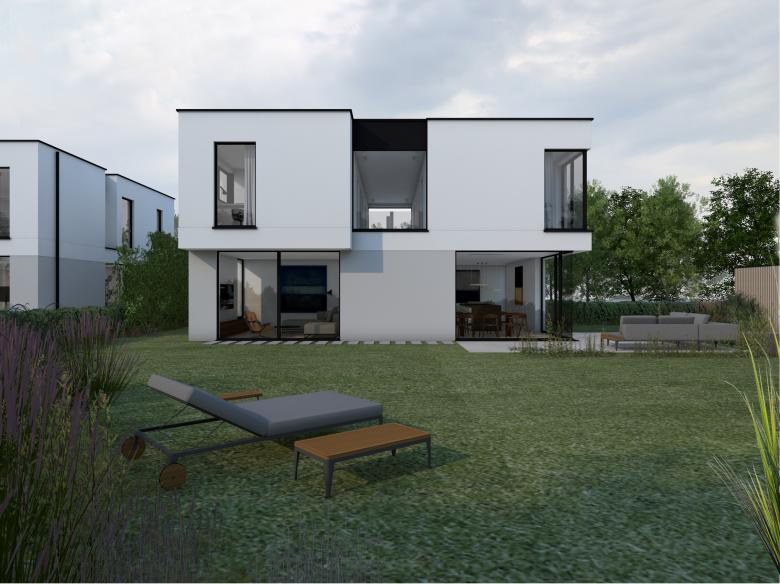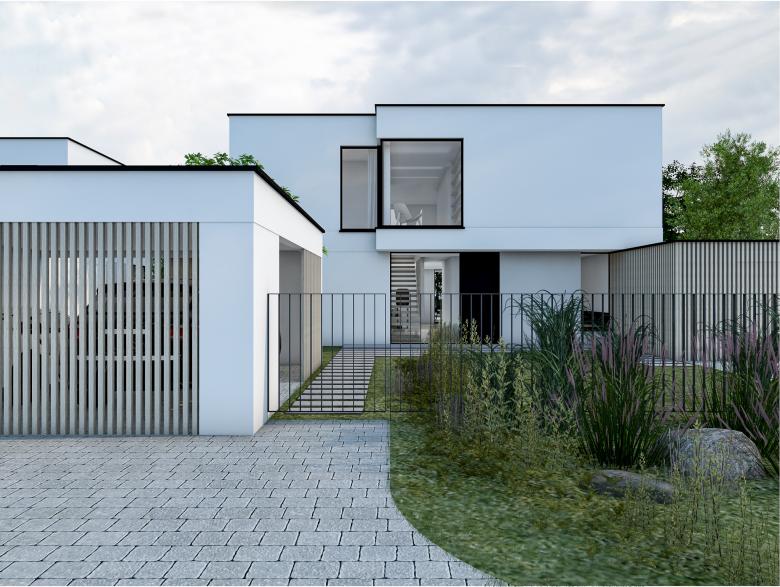 Auf einem großzügigen Grundstück entstehen zwei freistehende Einfamilienhäuser. Durch eine bewusst einheitliche, zurückhaltende Architektursprache entsteht ein Ensemblecharakter, trotz unterschiedlicher Bedürfnisse und Raumprogramme in beiden Häusern. In beiden Häusern entstehen unterschiedliche Galerien. Die Landschaft wird teilweise über Einschnitte und Lichthöfe in die Architektur einbezogen.