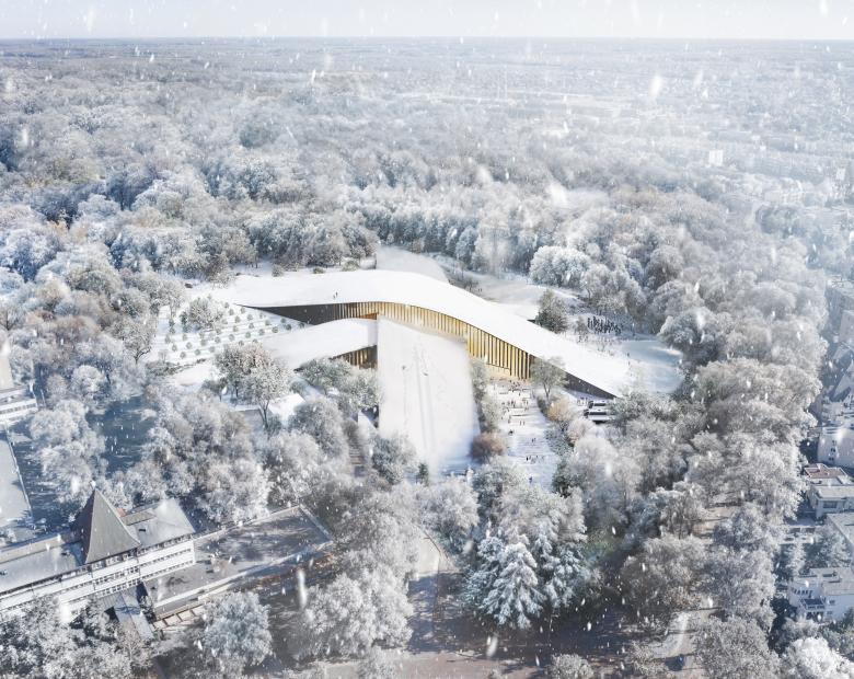 Approaching from any direction, visitors are met with open plazas, winding forest paths and framed views through and over the building. The museum is accessible from all sides, integrating it into both the urban fabric and the surrounding natural landscape. The arrival is marked by a generous southern plaza that forms a meeting point for community life and museum activities.