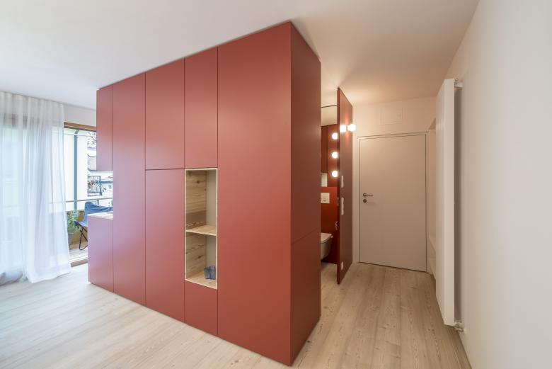 Aus dem Miniraum wurde das Maximum herausgeholt. Abstriche gibt es trotz der winzigen Ausmaße keine. Gänge übrigens auch nicht. Die Öffnung zum Balkon wurde so weit als möglich aufgebrochen. Hochwertigste Ausführung und Maßarbeit sind Grundvoraussetzung. Die Kosten pro Quadratmeter sind sehr hoch. Gefühlt ist dafür die doppelte Fläche entstanden.