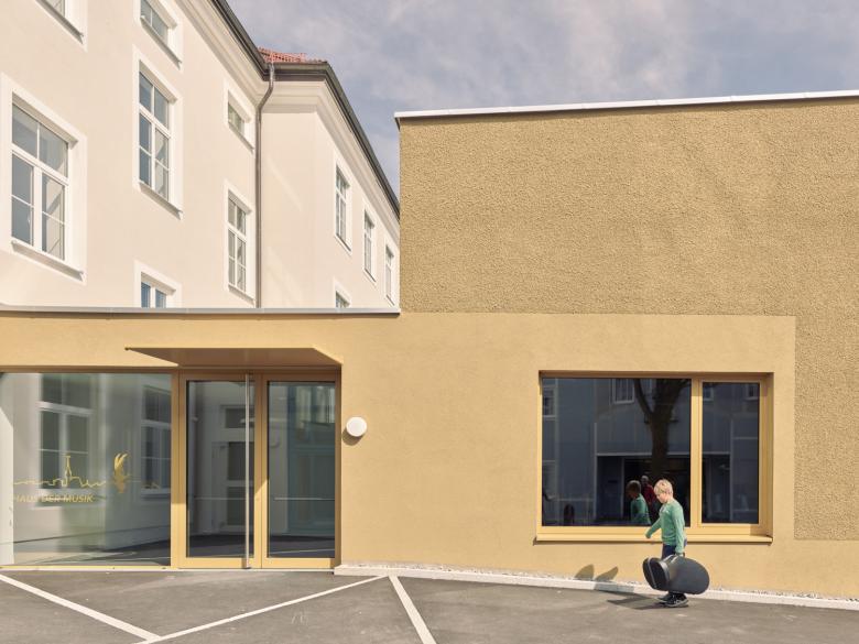 Bei der Wahl der Materialien wurde darauf geachtet, so viel wie möglich auf Natürlichkeit und Nachhaltigkeit zu setzen. Über ein Foyer gelangt man vom Saal in den Altbau, der in großen Teilen entflechtet und neu organisiert wurde. Das Erdgeschoß wurde als halb-öffentliche und multifunktionale Zone erdacht und beinhaltet neben dem Proberaum des Männergesangsvereins und diversen Räumen des Musikvereins auch das neue Stadtarchiv von Grieskirchen. Die oberen Stockwerke sind für die Nutzung durch die Landesmusikschule bestimmt.