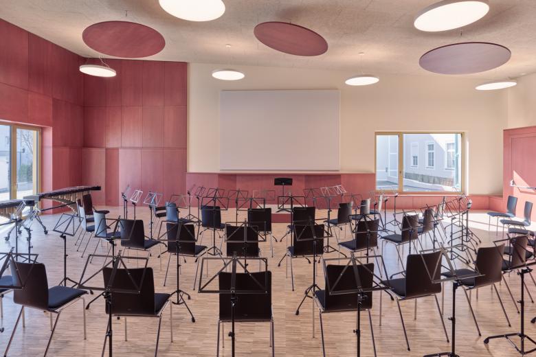 Das Herzstück ist der neu-errichtete Probensaal der Stadtkapelle, der dem Haus der Musik optisch wie funktionell ein unverkennbares Gesicht gibt. Hauptsächlich zur Nutzung als Musikproberaum ausgelegt, wird der Kubus auch für Vortragsabende und kleine Konzerte der Landesmusikschule genutzt. Die akustischen und funktionellen Herausforderungen eines Baus zur musikalischen Nutzung sind vielfältig. Und trotzdem sollte er nicht zu technisch wirken, sondern mit der Anmut eines Festsaals inspirieren. Schon in der Planungsphase wurde die Massivbau-Hülle hinsichtlich der Notwendigkeit absorbierender und reflektierender Flächen zusammen mit der Firma TAS-Bauphysik berechnet und optimiert. Die völlige Abwesenheit paralleler Wände und die spezielle Oberflächenbehandlung der Innenverkleidung sorgen gemeinsam mit der über die Diagonale schräg-geführten Decke aus schallabsorbierenden sowie reflektierenden Heradesign-Akustikplatten für eine hervorragende Akustik des Raums.