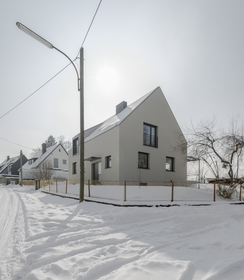 Mit seinem Satteldach bleibt der Baukörper der traditionellen Bauweise der 60er Jahr treu, führt die Form aber auf ihre schlichteste, von allem Dekor befreite Erscheinung, zurück. Reizvoll ist besonders, dass die bestehende Struktur des Hauses weitgehend belassen wurde und so der Charme der 60er Jahre ablesbar bleibt.