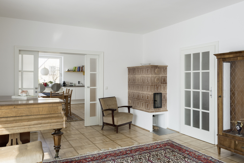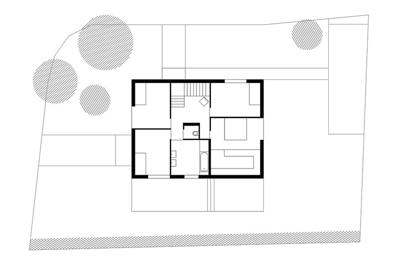 Das kleinvolumige Haus besitzt, trotz gering bebauter Fläche eine überraschend hohe Anzahl an Räumen und kann so den Anforderungen der 5-köpfigen Familie gerecht werden. Das Erdgeschoß, welches den Wohn- Ess- und Kochbereich sowie ein kleines Arbeitszimmer aufnimmt, bleibt in seiner Raumstruktur annähernd unverändert. Lediglich die Eingangszone mit Garderobe und kleiner Sanitärzelle sowie die Küche wurden adaptiert. Im Obergeschoss erfolgte zur Gänze eine Neuorganisation. Im Zuge der Erneuerung des Dachstuhls wurden großzügige Schleppgauben eingefügt, welche für eine ausreichende Belichtung der Kinderzimmer sorgen und dem Gebäude dessen besonderen Charakter verleihen.