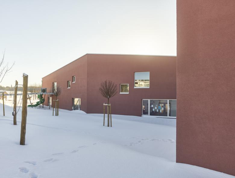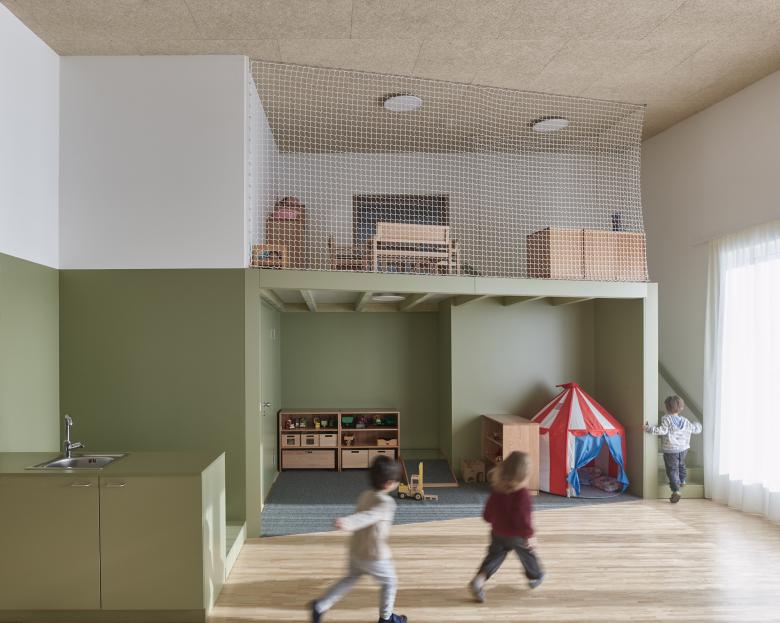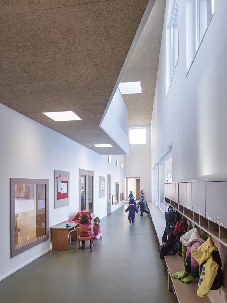 Die Gliederung in zwei Baukörper nimmt einerseits Bezug auf den Maßstab der Umgebung und entspricht andererseits den pädagogischen Anforderungen. Kindergarten und Krabbelstube sind in zwei Häuser getrennt. Dort wo es sinnvoll ist, treffen Krabbler und Kindergartenkinder aufeinander: beim Haupteingang und im Essensbereich. Das entspricht nicht nur den Bedürfnissen der Kinder, sondern schafft auch maßgeschneiderte Räume mit viel Licht und unmittelbarem Außenbezug sowie Zwischenräume und klar abgegrenzte Eingangsbereiche. Ein unabhängiger Betrieb mit guten Schnittmengen ist so garantiert.