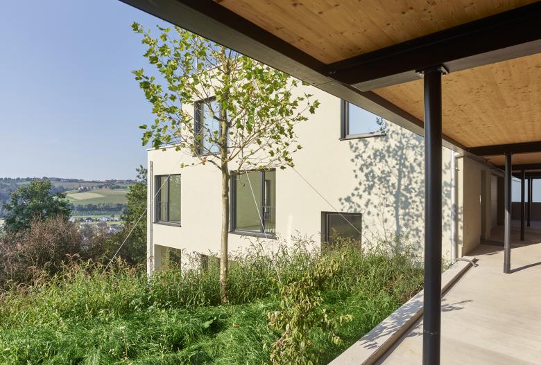 Auf einem Plateau im Hang befindet sich die gemeinsame Eingangsebene – die filigrane Flugdachkonstruktion bildet eine Spange mit Ausblick zwischen den beiden Baukörpern, darunter befinden sich gedeckte Zugänge und Stellplätze für die Bewohner*innen.