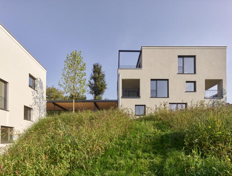 Hoch über dem Trattnachtal sind zwei ländliche Villen mit jeweils drei Wohnungen entstanden. Die zwei Häuser sind horizontal und vertikal zueinander versetzt in den Südhang eingebettet.