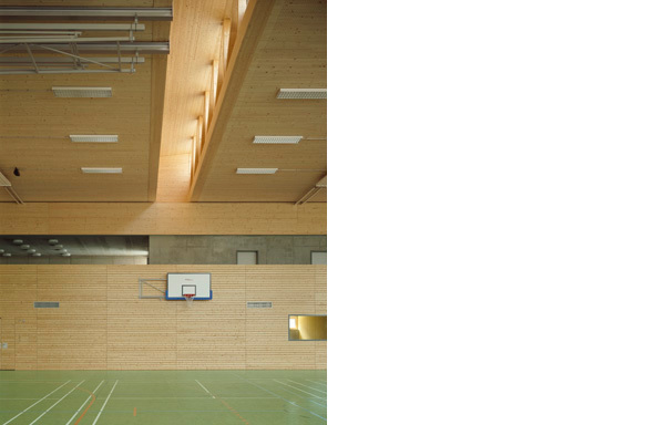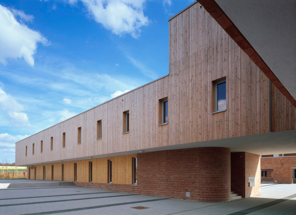 Die Bauzeit von sechzehn Monaten war äußerst knapp bemessen. Aus dieser Vorgabe ergab sich ein ebenso für die Konstruktion wie für die Gestaltung relevanter Aspekt: weite Teile des Tragwerks bestehen aus vorgefertigten Komponenten aus Beton oder Holz, die im weiteren Ausbau sichtbar belassen blieben. Eine wichtige, auch architektonische Absicht war die größtmögliche Robustheit aller Details und Oberflächen, die im Alltag der Nutzung Patina zulassen - ohne Einbußen für die Gestaltung. Dieser Robustheit entsprechend und dem Anspruch, die Materialien in ihrer „Natürlichkeit" zu zeigen folgend, sind die Fassaden zum öffentlichen Raum hin mit Sichtmauerwerk bekleidet, die zur offenen Landschaft hin mit einer senkrechten Holzschalung.