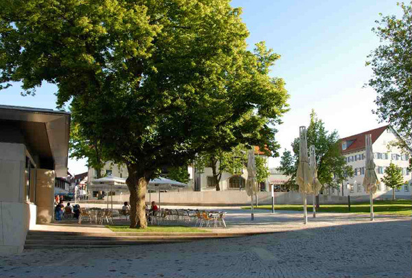 Der 2004 fertig gestellte Schlossplatz in Neuhausen ist das Ergebnis eines Architekturwettbewerbes, sowie des intensiv geführten Dialogs mit den Bürgern vor Ort. Vor der Neugestaltung präsentierte sich der Platz als eine von Fahrstraßen umgebene Grünfläche, die keinerlei städteräumliche Absichten erkennen ließ. Ziel des Entwurfes war es daher den Schlossplatz einerseits als "grünen Raum" zu erhalten und ihn anderseits als urbane Mitte erleb- und nutzbar werden zu lassen. Neben dem Grünraum mit seinen neu gepflanzten Hochstämmen definieren drei Elemente, sowohl räumlich als Platzkante, wie atmosphärisch den Platz: das Cafe, das "Rampenbauwerk" und das Wasserspiel. Heute ist der Schlossplatz im Selbstverständnis Neuhausens als besondere Leistung aller Beteiligten hoch geschätzt und akzeptiert. Er ist Marktstätte und als Treffpunkt im Alltag ebenso intensiv genutzt wie für eine Reihe von Festen- von der Fastnacht bis hin zur Fronleichnamfeier. Dies alles zusammen hat bereits in der kurzen Zeit seit der Fertigstellung des Platzes wesentlich zur Stärkung des Ortes beigetragen.