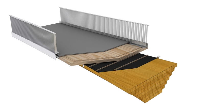 Eine neuartige integrale Massivholzbrücke – Das Konzept der Stuttgarter Holzbrücke basiert auf einem massiven, dem Herstellprozess und der Beanspruchung entsprechend abgestuften, tragenden Brettschichtholzkorpus der durch ein darüber aufgesetztes Belagsdeck dauerhaft geschützt ist. Der robuste, luftumspülte Massivholzkorpus wird unmittelbar in den Stahlbetonfundamenten verankert: an den Trägerenden in Holzfaserrichtung eingeklebte Gewindestäbe sind direkt in den Widerlagerkörper einbetoniert. Durch diese quasi-monolithische Verbindung wird ein neuartiger integraler Holzbrückentypus realisiert, der vollständig ohne wartungsintensive Lagerkonstruktionen und Dehnfugen auskommt.