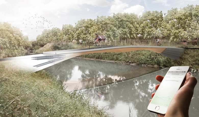 Über dauerhaft eingebaute Feuchtesensoren wird kontinuierlich die Ausgleichsfeuchte im Inneren des Massivholzkorpus dokumentiert. Die internetbasiert übertragbaren Daten werden so aufbereitet, dass ein einfach verständliches ‚App‘ einen kritischen Anstieg der Ausgleichsfeuchte anzeigt und eine entsprechende Inspektion auslöst. So kann man auch der mancherorts immer noch verbreiteten Skepsis gegenüber der Dauerhaftigkeit von Holzbrücken entgegen treten, die sich auf die nicht selten mangelhaft konstruierten Holzbrücken der 1970/80er Jahren gründet.