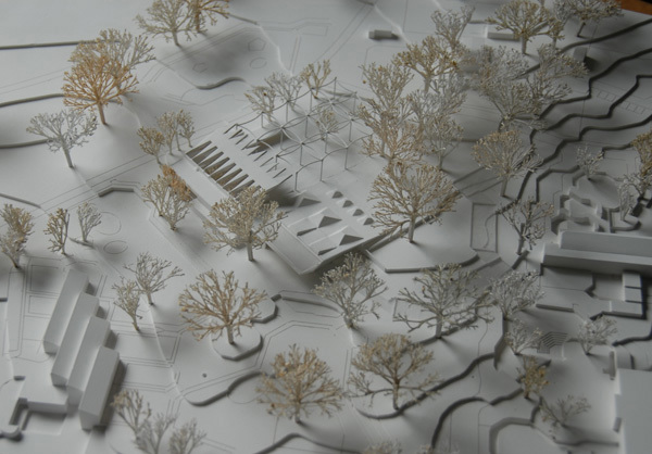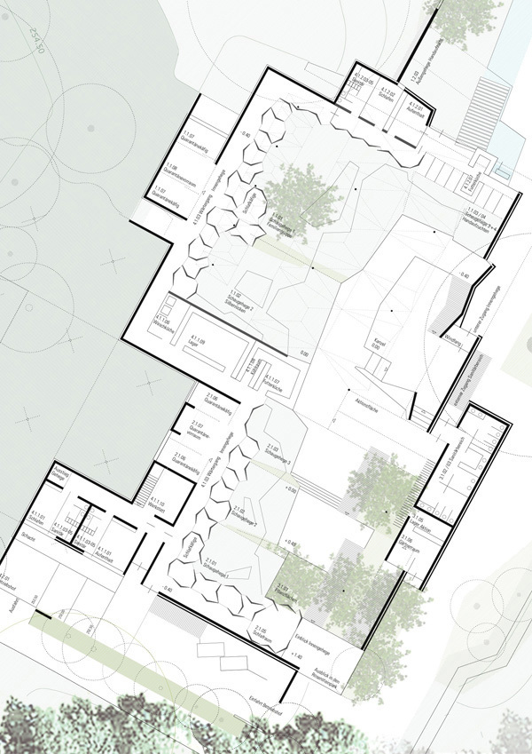Dem Grundgedanken „Stärkung der räumlich-visuellen Bezüge zum Rosensteinpark“ folgend entwickelt sich das Konzept für das neue Menschenaffenhaus. An den tiefsten Punkt des Geländes gelegt, nutzt es den natürlichen Geländeverlauf. Mit zusätzlichen Geländemodellierungen kann der Großteil der Programmfläche in den Hangeschoben werden und tritt als Baukörper wenig in Erscheinung. Die weiträumigen Lichtbeziehungen bleiben bewahrt. Teile der Dachflächen sind als Teil des Außengeheges naturnah begrünt. Entsprechend den Anforderungen an die nach Tierart variierenden Raumhöhen gliedert sich das Gebäude in zwei Teilbereiche. Die Innengehege der „bodenbewohnenden“ Gorillas sind horizontal organisiert im erdüberdeckten Bereich angeordnet. Die aus der Baustruktur entwickelte Lichtführung erzeugt das Helldunkel hoher Wälder in Analogie zum natürlichen Lebensraum der Tiere.Im Gegensatz dazu sind Innen- wie Außengehege der baumbewohnenden“ Bonobo mit einem hellen, lichten Raum in der Höhe organisiert.