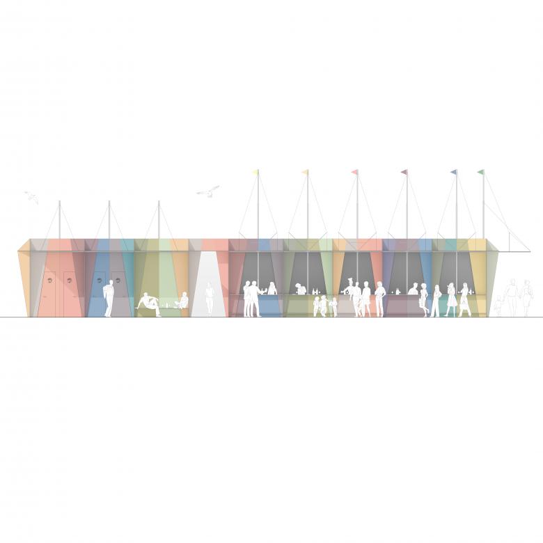 Mit einem kleinen Wink hinüber zu den Booten reihen sich die Masten des neuen Kiosks ins raumwirksame Baumraster ein. Eine einfache Konstruktion aus ineinander verschweissten Stahl-Spanten gliedert das Kioskgebäude in gleichförmige Raumabschnitte mit zwei unterschiedlichen Nutzungssequenzen. Auf der Nordseite die Kiosksequenz inklusive Nebenräume als Warmbereich und südlich die Toilettenanlagen und den Abgang zur Seewasserzentrale sinnfällig als Kaltbereich. Die gewählte Konstruktion verleiht dem Kiosk eine angebrachte Leichtigkeit. Standhaft, als moderner Neubau und doch mit provisorischen Zügen setzt er als eigenständige Architektur einen gesunden Kontrastpunkt zur wilden Stadtnatur. Der Pavillon schreibt zudem die Farbgeschichte rund um das Zürcher Seebecken weiter und steht dem Zeitgeist entsprechend bereit für die nächsten bunten Grossanlässe.