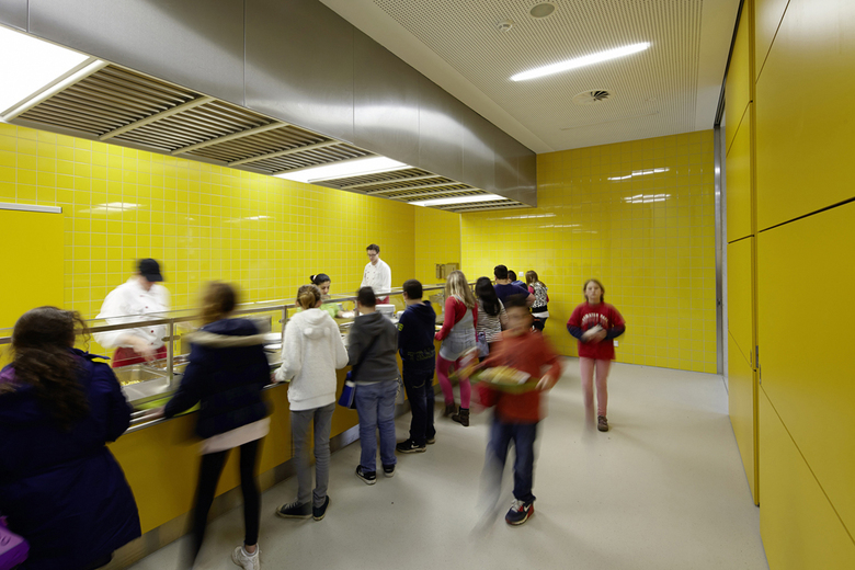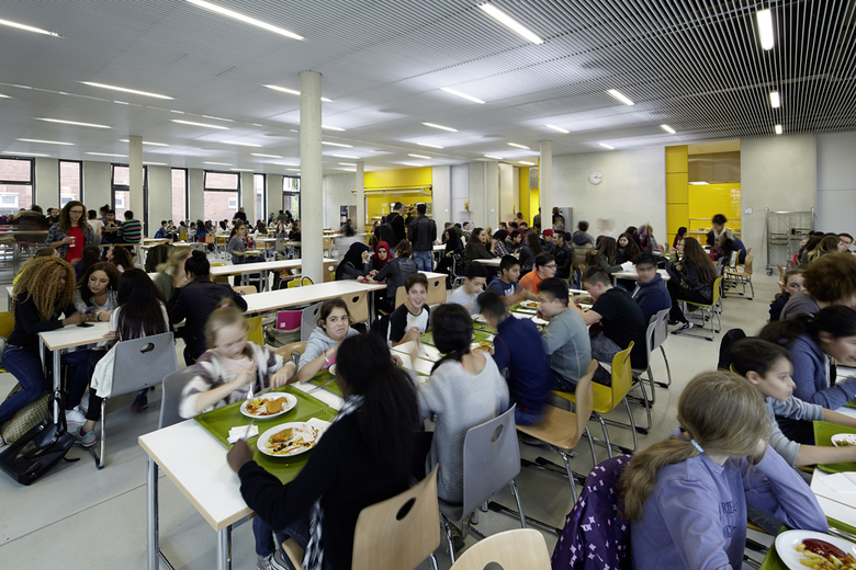 Der Speisesaal der Mensa kann mittig geteilt werden und lässt so eine zeitgleiche Nutzung beider Teile zu. Die Trennung ist so konzipiert, dass bei geschlossener Trennwand beide Nutzungseinheiten ohne funktionale Einschränkung über den Vordach- und Windfangbereich zugänglich sind. Neben dem Mensabetrieb auf halbierter Fläche, ist zeitgleich die Nutzung des anderen Teils als Aufenthaltsraum für die Oberstufe möglich, dem auch ein Kiosk zugeordnet ist.