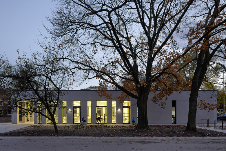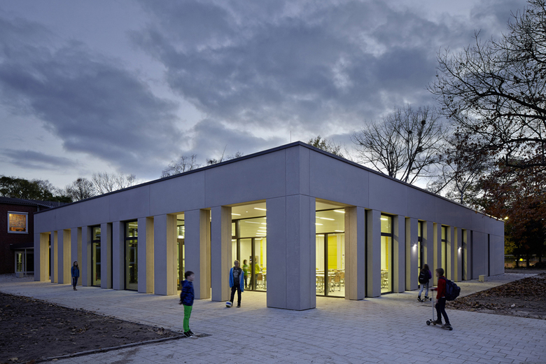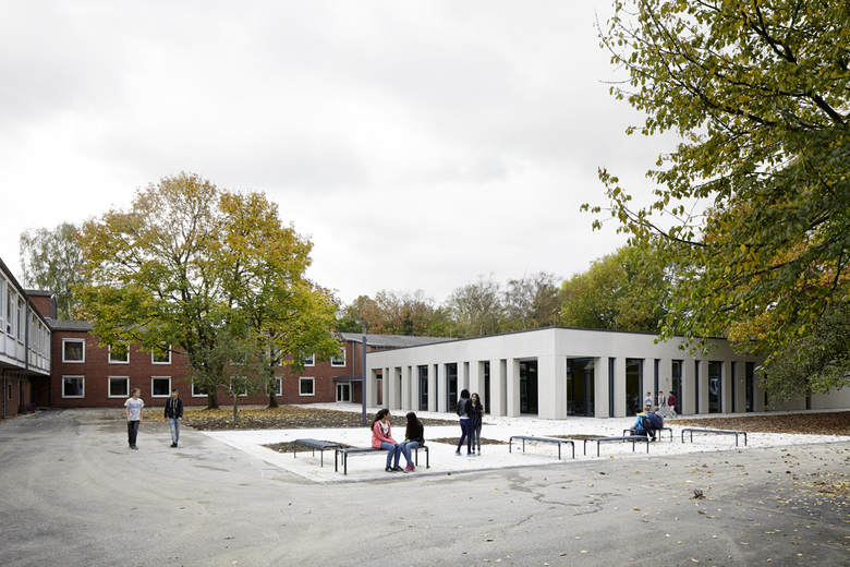 Der Neubau der Schulmensa auf dem Gelände der Katharina-Henoth-Gesamtschule in Köln-Höhenberg ersetzt den kleineren Altbau am selben Ort. Eingebettet in die Grünanlagen der Schule zeigt sich die Schulmensa als Solitär, der sich an den Gebäudekanten der Aula orientiert und maßvolle Außenräume zu den bestehenden Gebäudeflanken definiert.