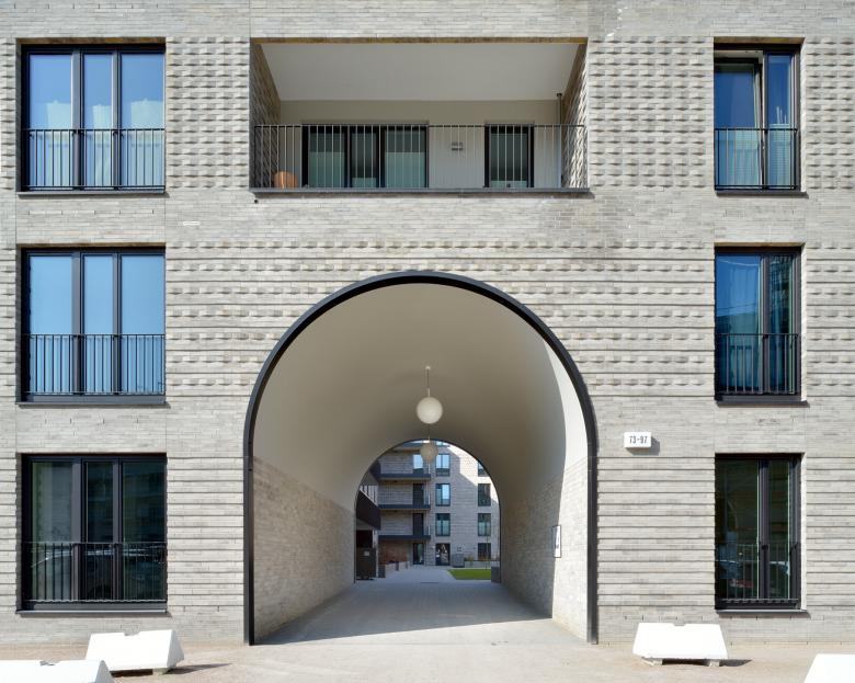 In direkter Nähe zum Hamburger Stadtpark, zwischen der Hebebrandstraße im Norden und dem Jahnring im Süden, liegt das neue Wohnquartier Pergolenviertel. Das Leitbild der Stadt sah die Verwendung des Backsteins als einheitliches Material vor, wobei durch ein abgestimmtes Farbkonzept ein Verlauf von Norden nach Süden die Farbgebung der Backsteinbauten von Grau zu Rot wandelt und dem Pergolenviertel seine Einzigartigkeit verleiht. Auf dem nördlich gelegenen Baufeld 2b wurde ein Wohnhaus mit 64 Eigentumswohnungen sowie einer Tiefgarage realisiert. Das äußere Erscheinungsbild des Baukörpers ist geprägt durch seine Backsteinfassade die durch hervortretende und zurückliegende Steinreihen akzentuiert wird. Kombiniert mit schwarzen Metallbauteilen sowie den Glasflächen steht der helle Backstein klar im Vordergrund. Das Fassadenkonzept basiert auf dem Grundthema des „Verlaufs“ und nimmt damit das Leitbild der Stadt auch im Gebäude auf: Die verwendeten Formsteine sind in Form von Bischofsmützen zwischen den Fensteröffnungen angeordnet und lassen eine Art „Füllung“ entstehen, einen vertikalen Verlauf, der je nach Höhe des Geschosses ein engeres Muster aufweist. Der vertikale Verlauf wird unterstützt durch eine Art „Band“, das im Langformat ohne Reliefbildung gemauert wurde und sich so stark von der „Füllung“ abhebt. Neben der Akzentuierung der Geschosse verbinden die umlaufenden Bänder die einzelnen Baufelder miteinander und verleihen den Wohnhöfen eine horizontale Homogenität. Es entsteht ein Muster, welches der Fassade seine zurückhaltende Lebendigkeit gibt, ohne das strenge und homogene Gesamtkonzept zu beeinflussen. Gleichzeitig verleiht es dem Baukörper seinen identitätsstiftenden Charakter im Viertel. Die Wohnungen verteilen sich auf insgesamt vier Treppenhäuser, die vom Hof aus durch einen großzügigen Rundbogendurchgang erschlossen werden. Die verschiedenen Wohnungsgrößen und Grundrisse bieten vielfältige Nutzungsmöglichkeiten. So werden unterschiedliche Zielgruppen angesprochen und ein durchmischtes Wohnen gefördert. Der Innenhof bietet neben Kinderspielflächen, Aufenthaltsbereiche und Platz für Urban Gardening Hochbeete. Im Erdgeschoss befindet sich ein großzügiger Gemeinschaftsraum mit eigener Loggia. Das Gebäude ist als KfW-Effizienzhaus 55 errichtet und mit einer NaWoh-Zertifizierung ausgezeichnet.