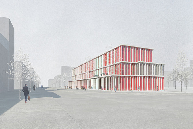 Das Bauhaus Museum präsentiert sich als filigranes, dreigeschossiges Bauvolumen am nordöstlichen Rand des Stadtparks. In Anlehnung an das alte Stadtgefüge Dessaus vor dem Zweiten Weltkrieg wird damit ein prominenter Standort neu besetzt. Mit seiner langgestreckten Form fasst das Gebäude den Strassenraum entlang der Kavalierstrasse und definiert gleichzeitig einen klaren Übergang zwischen Stadt und Park. Der differenziert gestaltete «Gebäudekopf» an der Kreuzung Friedrich-/ Kavalierstrasse sowie der leichte Rücksprung aus der Strassenflucht heben das neue Museum als besonderen kulturellen Ort im Stadtraum hervor. Dank der kompakten Bauweise beschränkt sich das Mass der Interventionen im Park auf kleine Eingriffe, die das Museum in der Umgebung verankern.