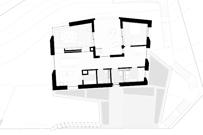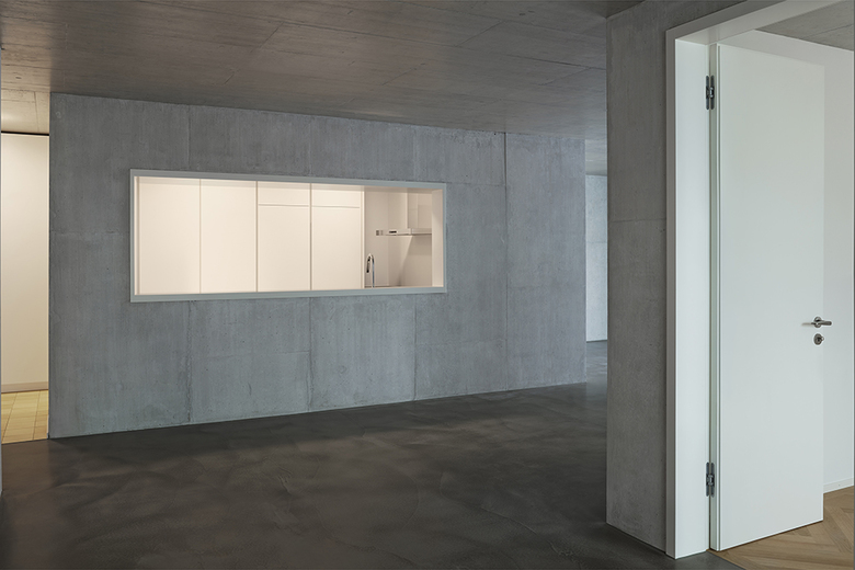 Für ein Mehrfamilienhaus in Baden entwerfen wir innerhalb einer schmalen, dreieckigen Parzelle am Hang einen kubischen Solitär, der dem gebauten Kontext trotzt und sich im Hang verankert. Es gibt kein Treppenhaus, vielmehr sind drei Wohnungen derart gestapelt, dass sie jeweils einen eigenständigen Zugang erhalten. Jede Wohnung basiert auf einer kreuzförmigen Grundstruktur, diese wird jedoch individuell interpretiert: Im Erdgeschoss entsteht eine Familienwohnung mit grosser Wohnküche, Terrasse und Garten. Darüber befindet sich eine Loftwohnung mit herrlichem Ausblick in das Limmattal, und die Dachwohnung basiert auf einem Raum-zu-Raum-Prinzip mit privatem, innen liegendem Patio.