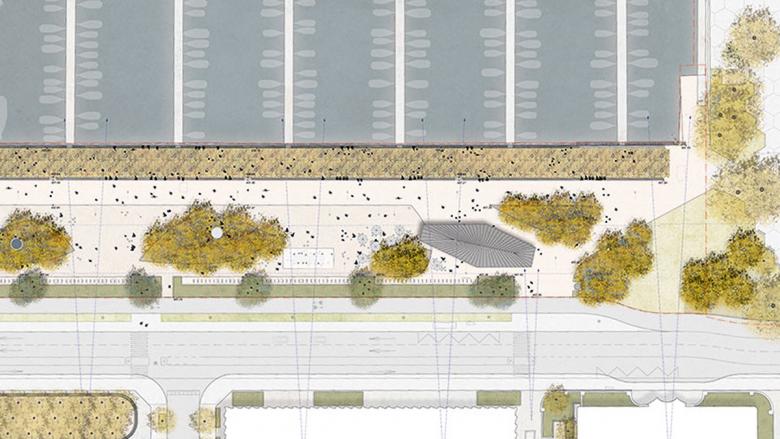 Der Kiosk will nicht mehr sein als er ist. Er ist keine Skulptur und kein Objekt, das nach Aufmerksamkeit sucht, sondern eine sorgfältig plazierte Gebrauchsarchitektur. Eine Bude, an der man sich verpflegen kann, mit zwei Toiletten. Er ist längsgerichtet, wie die Promenade selbst und sucht die Nähe der grossen Schnurbäume, die das Ende der Hafenpromenade besetzen. Die schräg zulaufende «Nase» streckt sich dem Freiraum entgegen, ein Vordach bietet Schutz. Auf der anderen Seite wird man von einer Sitzbank empfangen. Es gibt keine Rückseite. Der kleine Baukörper ist von allen Seiten zugänglich. Zum See hin bieten Glasvitrinen genügend Auslageflächen, um kleine Köstlichkeiten präsentieren zu können. Die Hebefenster können individuell geöffnet werden, sodass – je nach Jahreszeit – ein, zwei oder sogar drei Personen nebeneinander arbeiten können. In der kalten Jahreszeit sind nur die beiden vorderen Fenster geöffnet, sodass der Innenraum nicht zu stark auskühlt. Bei grossem Ansturm hilft die Länge für einen zügigen Ablauf. Die Dachkonstruktion bietet Platz für einen robusten Holzrolladen, der nachts und in Wintermonaten für den Sicherheitsabschluss sorgt. Das Dach sitzt abgelöst vom Baukörper auf dem hölzernen Unterbau. Das Glasband lässt den Kiosk leicht und durchlässig wirken. Durch die parallelen Flanken passt sich der Bau gut zwischen die Baulinien ein ohne sich den Bewegungsflüssen unterzuordnen. Denn ein bisschen kantig darf er schon sein, dieser Kiosk an der neuen Hafenpromenade.