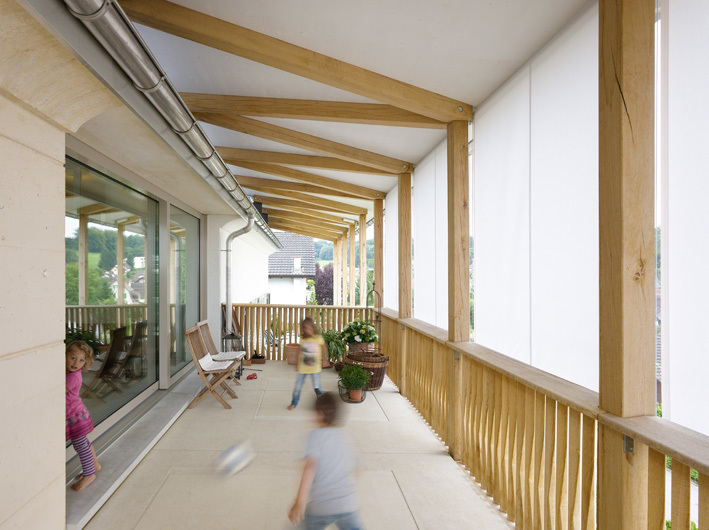 Zwei verbindende Elemente halten Alt und Neu wie eine Klammer zusammen: Nordseitig klappt das Dach für ein durchlaufendes Fensterband auf, im Süden ist über die gesamte Gebäudelänge eine Loggia vorangestellt. Sie greift mit ihrem eigenständigen Ausdruck in die Semantik des Bestandes ein, das Vorhandene wird neu interpretiert.