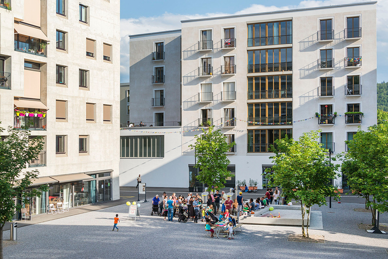 Wo Plätze, Gassen und Grünflächen die Qualitäten des öffentlichen Raums bestimmen, braucht es städtische Dichte. Eine spannungsreiche Sequenz der Aussenräume sowie publikumsorientierte Nutzungen im Erdgeschoss beleben das Quartier. Neben dem reichen Angebot an gemeinschaftlich genutzten Räumen werden auch individuelle Rückzugsräume immer wichtiger. Die Besonderheit dieses Projekts liegt genau in diesem Spannungsfeld: Geborgenheit und Privatsphäre auf der einen Seite und dem vielfältigen Angebot, an der Gemeinschaft teilzunehmen, auf der anderen Seite.