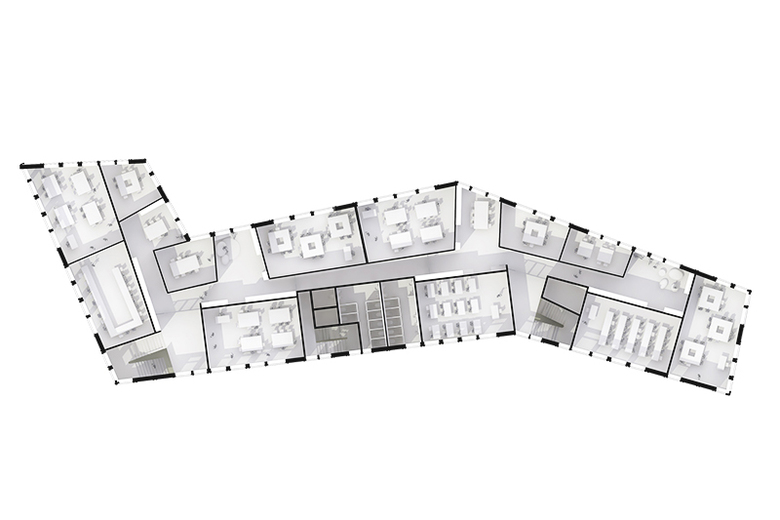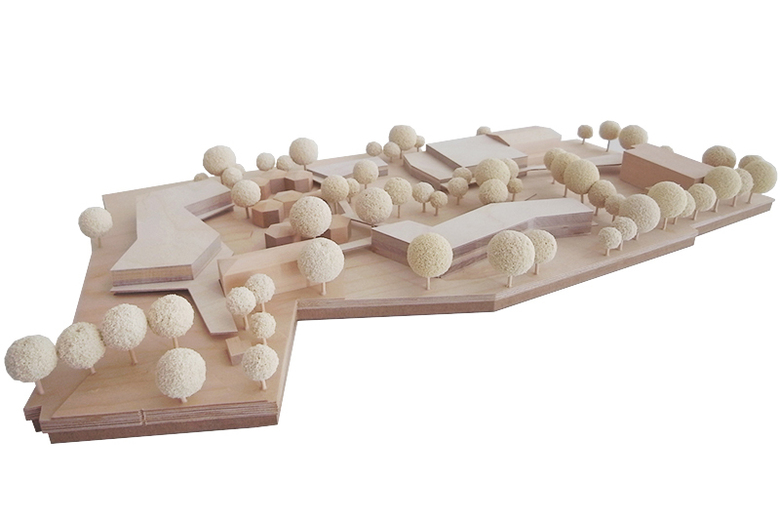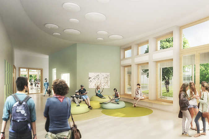 Als zweigeschossige Pavillonbauten ordnen sich die Gebäude dem Park mit seinen Bestandsbäumen unter. Gleichzeitig passen sie sich durch die geringe Höhe harmonisch in das dörfliche Umfeld ein. Auch die Kubatur des Forums fügt sich in Ausbreitung und Höhe gut in die Umgebung ein, indem es sich mit seiner Schmalseite zum Stadtraum öffnet. Diese schafft eine neue, explizite Adresse: Es entsteht ein großzügiger Platz, der als Angebot für den Stadtteil als Quartiersplatz die Eingangssituation klar definiert und so die Schule stärker in ihr soziales Umfeld einbindet.