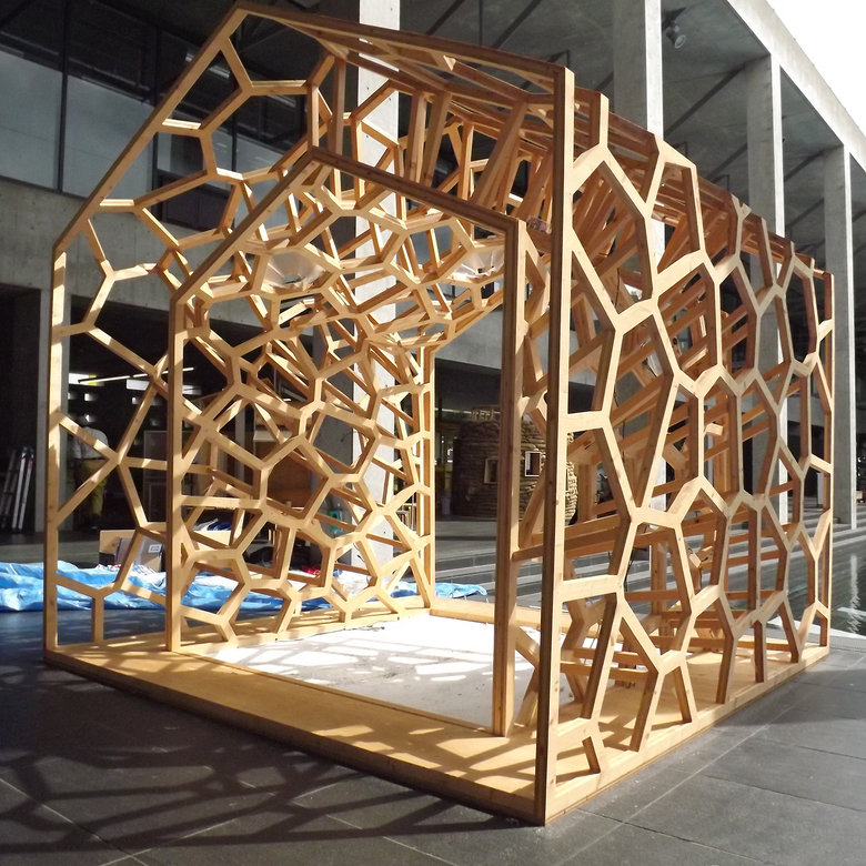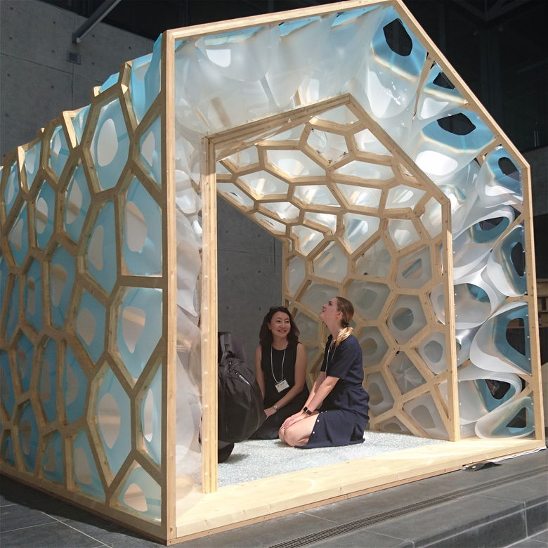 わたしたちはこの難しいテーマに対して、1.「空間を歪ませる」≑「空間にむらをつくり出す」、2.外部の環境を遮断するのではなく環境に応答する建築とする、という方針で臨みました。具体的には、トンボの羽や動物のなわばりなどに見られるボロノイ図形を骨組みのパターンに用いて空間を歪ませ、また、必要に応じて開いたり閉じたりする、外部の環境とやり取りするための数多くの孔を備えた、生き物の様な建築を提案しました。訪れた人がこの茶室の中に入ると、それを感じて、Breathing Pleats(呼吸するひだ)と名付けた孔が呼吸するように開閉し始める仕組みとなっています。