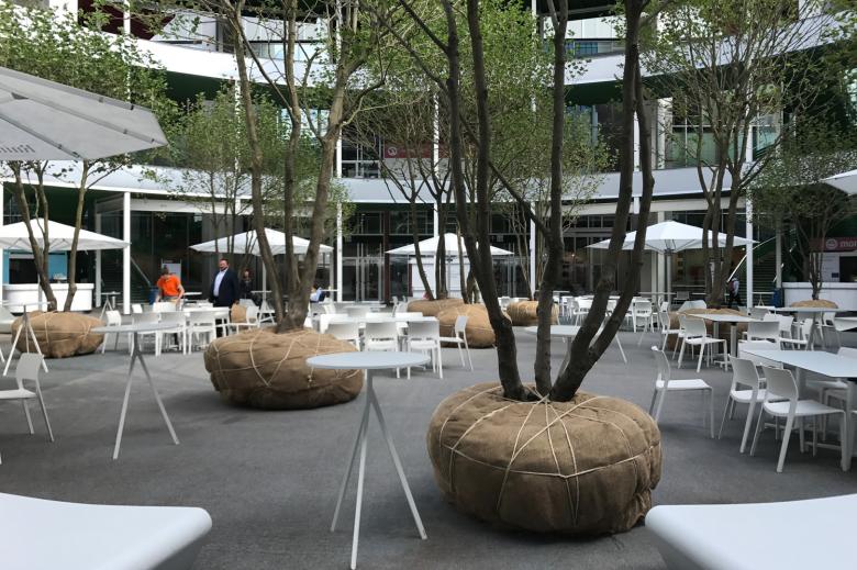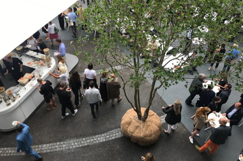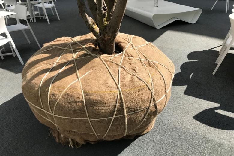 Wie die Messebesucher waren die Bäume hier Gäste. Ihre Wurzelballen blieben über der Erde, sichtbar. Die Bäume als Inbegriff der Langlebigkeit konnten an der Art Basel keine Wurzeln schlagen, das drückte sich in der Platzierung auf dem Asphalt oder in Aussparungen des zu organischen Formen geschnittenen Kunstrasens aus. Unprätentiös und schlicht stand der temporäre Wald direkt auf dem Boden, die Wurzelballen sicher in Jute verpackt.