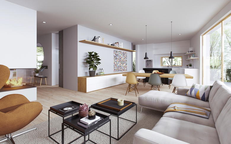 Im Innenraum zieht sich die Dynamik durch flexibel gestaltete Öffnungsmöglichkeiten zwischen den Räumen und Geschossen fort. Der Eingangsbereich ist geprägt durch ein Treppenelement mit einläufiger Treppe, die von einem Luftraum zum Obergeschoss begleitet wird. Die L-förmige Wand, die den Bereich räumlich definiert, ist durch Schiebeelemente zu den Wohnräumen schließbar. Somit entstehen vielfältige Blickbeziehungen zwischen oben und unten, sowie innen und außen. Wohn-, Ess- und Kochbereich öffnen sich zu einer großen Wohnterrasse. Im Obergeschoss werden die Individualräume durch einen galerie-ähnlichen Flur erschlossen.