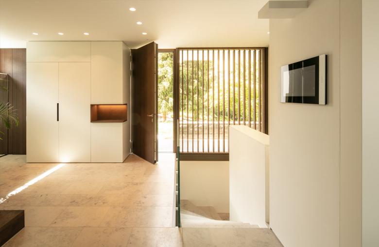 Vom Entree unter der markanten Fuge in der Fassade gelangt man ohne Umwege in den lichtdurchfluteten Wohnbereich, wo der aus tiefschwarzem Granit in die Wand integrierte Kamin das einzige Element ist, das die Rundum-Sicht nach draußen, auf den reichen Baumbestand, für einen Moment unterbricht. Der Esstisch verbindet den Wohn- mit dem Koch- und nach einem Schritt ins Freie mit dem privaten Lounge-Bereich im Garten, wo ein Außenkamin für Wohnlichkeit sorgt und die Grenzen zwischen innen und außen verwischt. Im Obergeschoss findet die Familie ihre privaten RückzugsraÅNume. Im Untergeschoss gelangt man über die Garage direkt in die offen gestaltete Garderobe. Im gesamten Haus dominieren neben weiß vor allem warme Farbtöne, Naturstein, Leder, dunkler Stahl und geräuchertes Eichenholz. Den eingesetzten Materialien wird in ihrer Reduktion und in der Mischung verschiedener haptischer Oberflächen besondere Wertschätzung entgegengebracht. So schafft die Architektur einen respektvollen Hintergrund für Möbel, Objekte und das Leben der Bewohner.