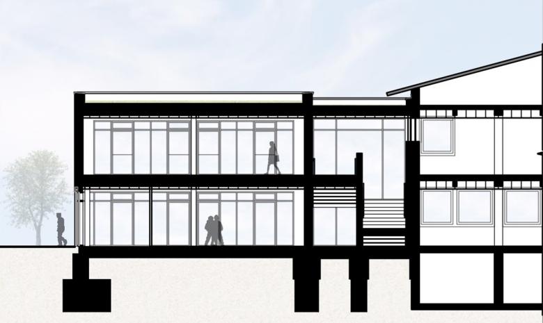 Der zweigeschossige Anbau wurde als Massivbau konzipiert und hat eine Gesamtnutzfläche von rund 365 Quadratmetern. Das Flachdach ist bereits für Installation und Betrieb einer PV-Anlage ausgelegt. Der Übergang zwischen Bestandsgebäude und Anbau wurde als verglaster Zwischenbau mit innenliegender Treppenanlage gestaltet. Die offene Architektur des Anbaus ermöglicht zudem eine modulare Erweiterung des Gebäudes ohne weitreichende Eingriffe in die Bausubstanz.