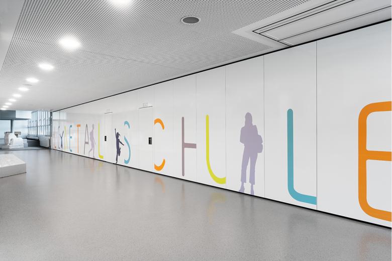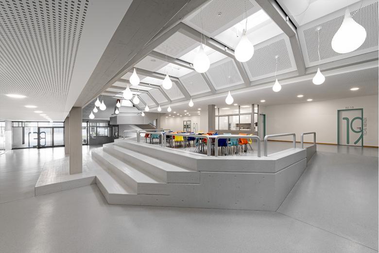 Im Bestandsgebäude wurden außerdem Flächen und Erschließung von Aula, Lehrküche und Mensa überarbeitet. Die Optimierung von Flächen, Zuschnitten und Mobiliar ist auch konsequent in den Räumlichkeiten für Verwaltung und Schulleitung einschließlich Lehrerzimmer und Bibliothek umgesetzt. Neu gestaltete Aufenthaltszonen werten diese Bereiche auf und verbessern die Nutzungsqualität insgesamt.