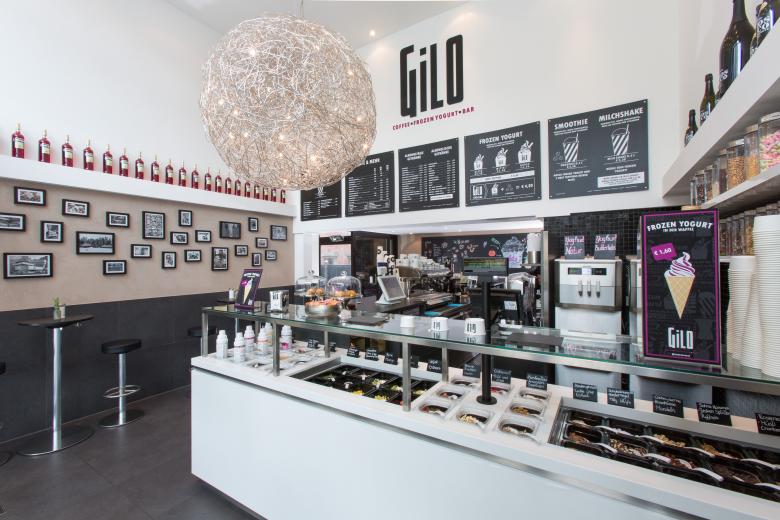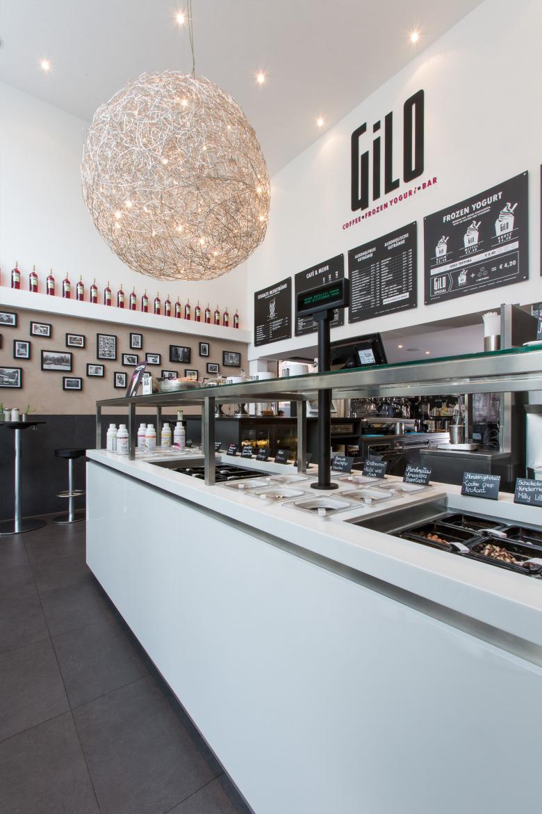 Unser Büro wagte sich an die schwierige Umsetzung: Die Zwischendecke wurde zu großen Teilen entfernt, um einen einzigen hohen Raum für Theke, Auslage und Stehbistro zu schaffen. Gestaltungselemente wie Wandbilder, stilvoll bestückte Regale, Wandbeschriftung und eine hängende Deckenbeleuchtung betonen die Offenheit und Raumhöhe zusätzlich.