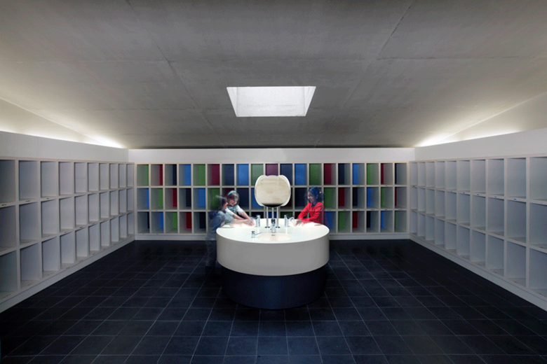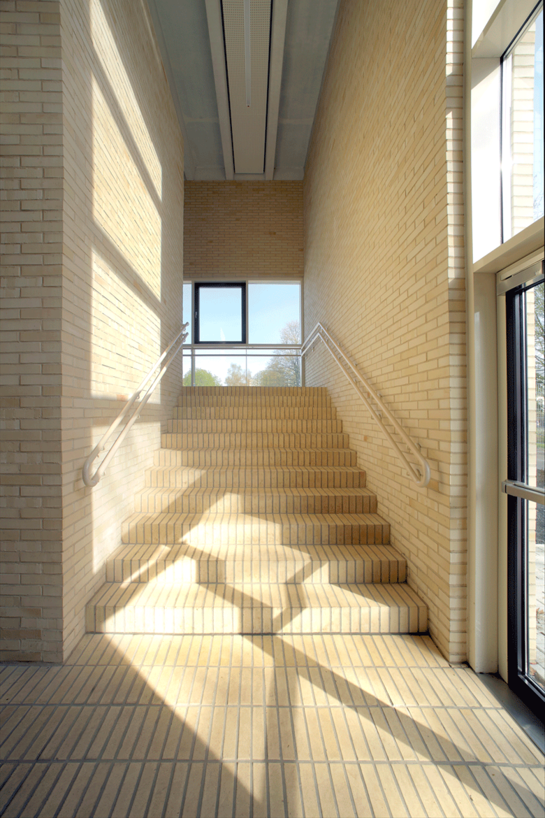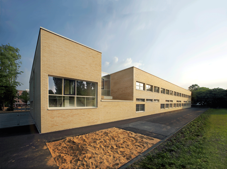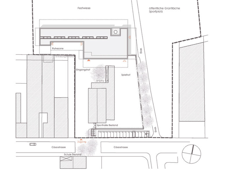 Der für den Erweiterungsbau der Gemeinschaftsgrundschule zur Verfügung stehende Bauplatz befindet sich auf dem Grundstück einer vorhandenen Schulsporthalle, welche dem bestehenden Schulbau gegenüber liegt. Im Norden des Grundstücks schließt eine großzügige, städtische Festwiese an, welche den Blick auf die Matthiaskirche freigibt. Eine alte Platane hinter der bestehenden Sporthalle markiert den Zugang und wird Ausgangspunkt des Entwurfskonzepts. Ziel des Entwurfes ist es, im Dialog mit dem bestehenden Klinkerbau der Sporthalle rund um die alte Platane ein Ensemble zu schaffen, welches den bestehenden verborgenen Hinterhof in eine kleine urbane Situation aus Straßen, Räumen und Plätzen überführt. Der Neubau ist janusköpfig. Nach Norden wird eine präzise Raumkante gesetzt, welche den Rand der Festwiese markiert. Ein einziger Einschnitt im Volumen markiert die Sichtbeziehung zum Kirchturm vis-à-vis. Nach Süden ist der Baukörper skulptural geformt. Vor-, Rücksprünge und Auskragung markieren Platzraum und Eingang. Die Materialgleichheit aller Flächen unterstützt die Skulpturalität des Baukörpers. Die Idee des „Verborgenes sichtbar Machens“ wird mit dem gelben Klinker fortgeführt. Es zitiert die Materialisierung des Inneren der Sporthalle. Dem Bild der kleinen Stadt entsprechend werden Qualitäten somit erst beim genauen Hinsehen und/oder Bewohnen sichtbar. Besucher und Nutzer des Neubaus werden zunächst durch die kleine Eingangshalle aufgenommen, von welcher aus sie sich in die einzelnen Räume und Geschosse verteilen. Der gesamte OGTS Bereich mit Betreuungsräumen und Speisesaal, sowie die zugeordneten Funktionsräume befinden sich im Erdgeschoss, zusätzlich oberbelichtete Klassenräume und Lehrerzimmer sind im Obergeschoss untergebracht. Alle Wandflächen der Wege und Gemeinschaftsräume sind ebenfalls aus gelben Klinker erstellt. Lediglich die Klassenräume sind auf Wunsch der Nutzer „neutral“ weiss verputzt. Farbige Kuben markieren jeweils die Klassenzugänge. In den Treppenräumen wird durch die Verwendung des Klinkers auch als Bodenbelag ein Spiel aus Material, Licht und Bewegung provoziert und somit das Haus auch zur Architektur-Schule.