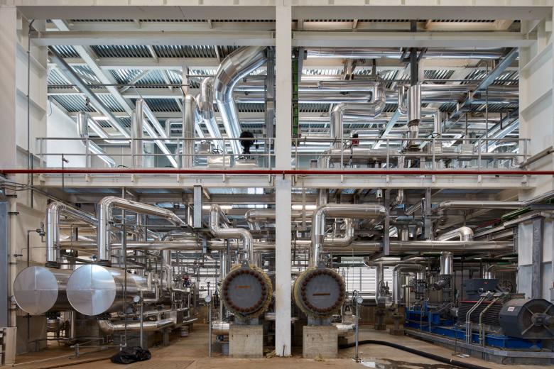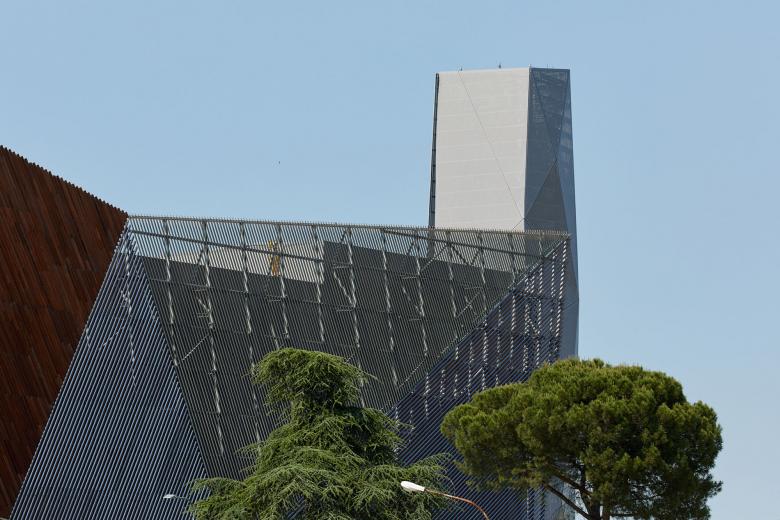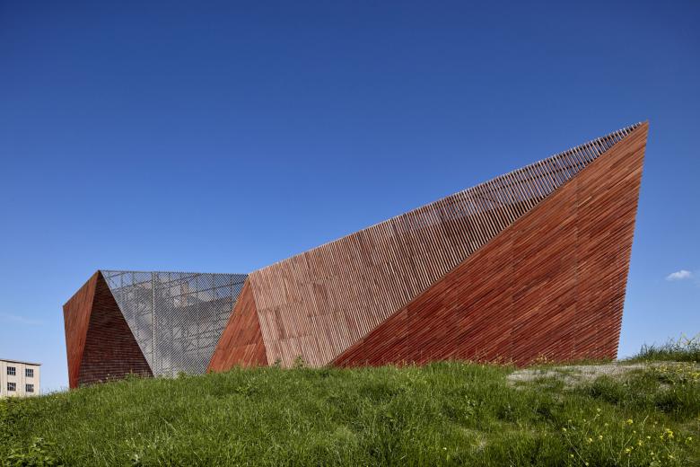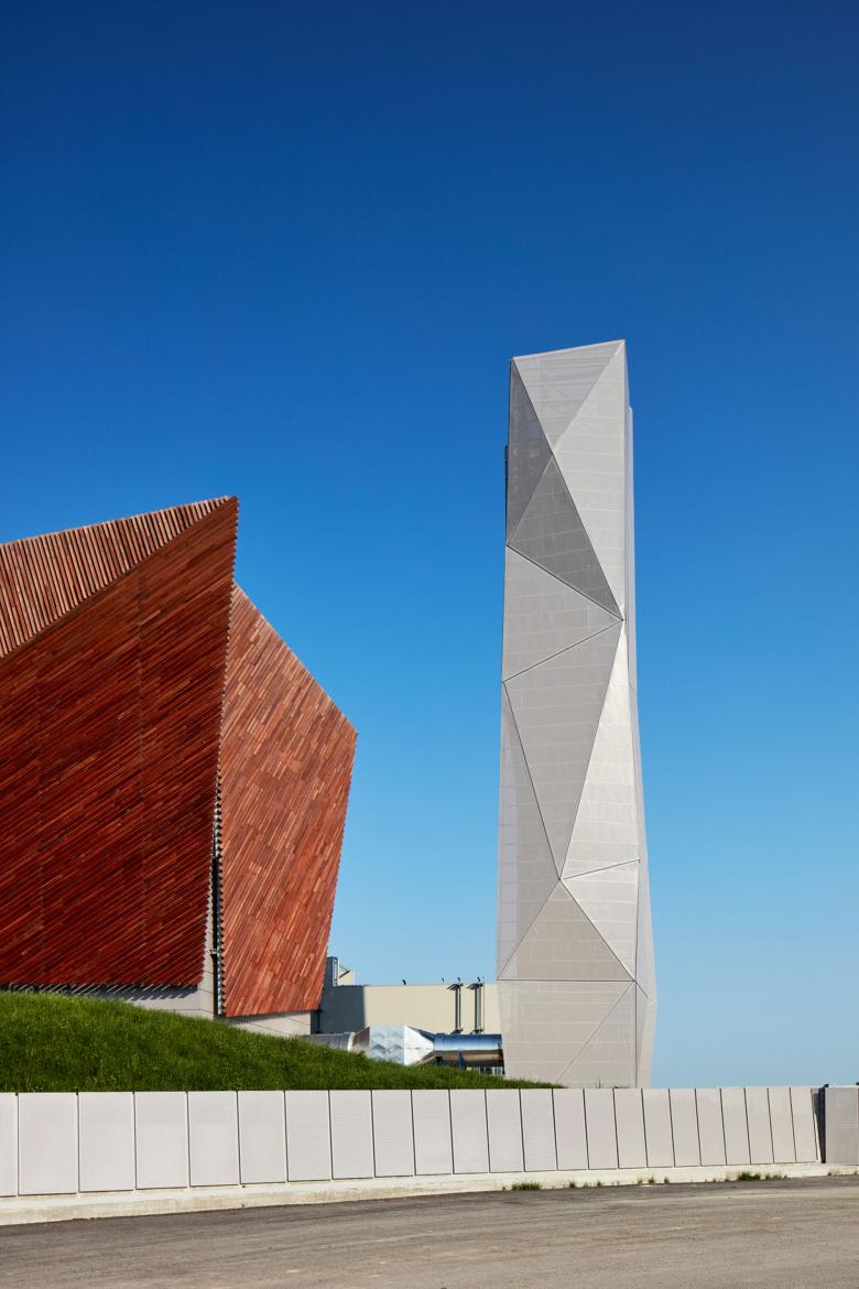 Le grandi superfici triangolari che coprono i volumi della caldaia e del camino sovvertendone le geometrie sono realizzate con strutture in acciaio sulle quali è posata una tessitura lignea a elementi paralleli. L’orditura delle scandole lignee segue però un pattern che cambia direzione a ogni faccia, offrendo così all’osservatore percezioni costantemente mutevoli in funzione del punto di osservazione, delle differenti ore del giorno o delle condizioni di luce. Il rivestimento in legno è anche un omaggio all’arte dell’intreccio e alle architetture nomadiche.