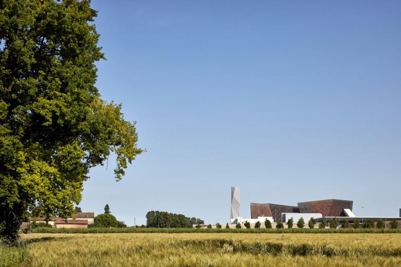 Il masterplan del Polo definisce un dispositivo ambientale a bassa tecnologia originato dal disegno di un terrapieno che funge da punto di interfaccia tra l’area rurale e quella industriale. “Tutto il progetto parte dal disegno del margine”, racconta Giovanni Vaccarini per spiegare come attraverso la presenza e il progetto naturalistico delle “dune”, tipiche del paesaggio adriatico e qui realizzate su tutto il confine dell’area, si sia proceduto a una generale opera di schermatura e mitigazione ambientale del polo. I bordi dell’area sono stati pensati come dei terrapieni dall’altezza variabile tra tre e dieci metri, sormontati da alberi e percorsi da piste ciclabili e pedonali, che definiscono il margine dell’intervento e l’interfaccia tra i due ambiti: quello agricolo e quello dedicato alla produzione energetica.